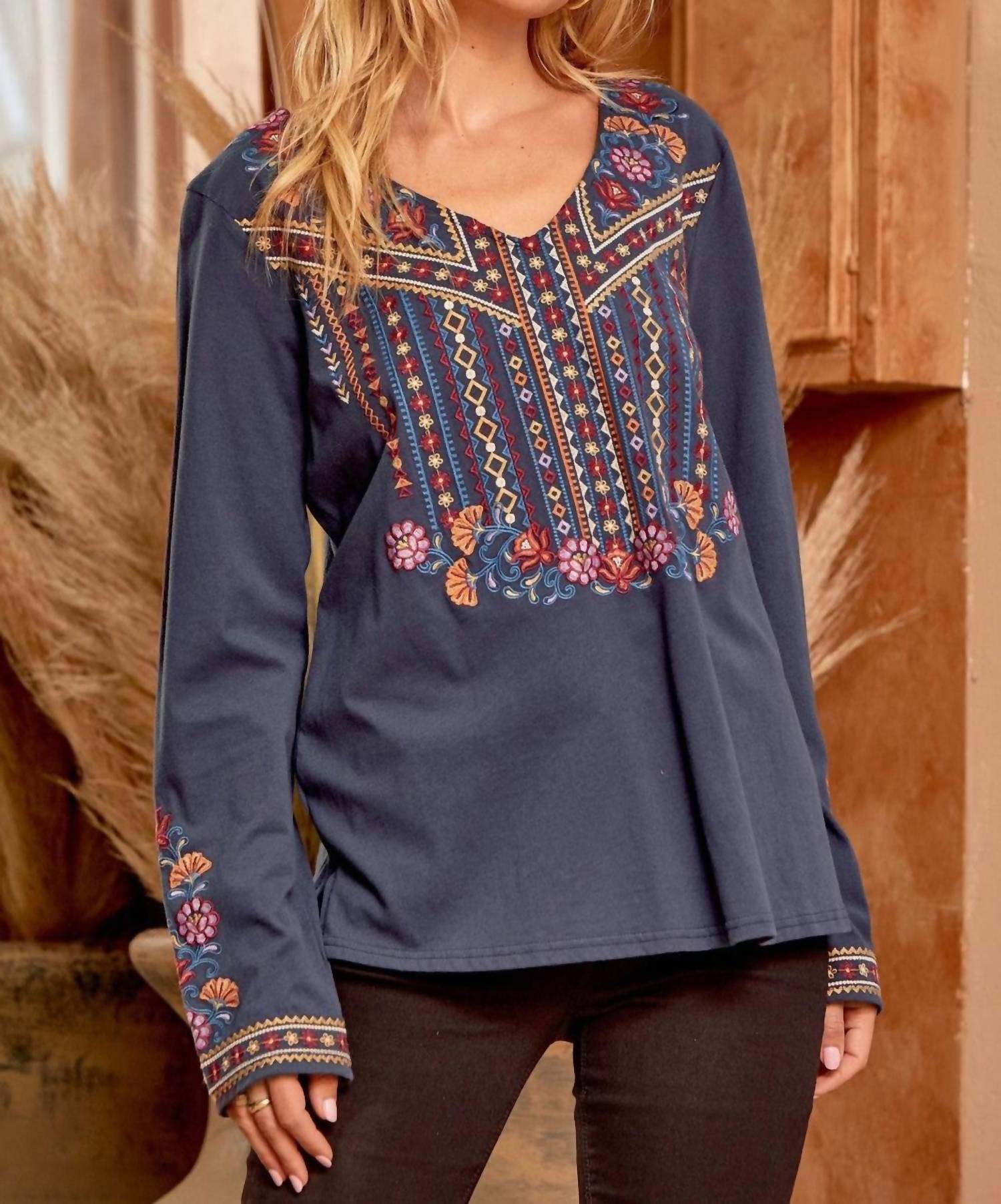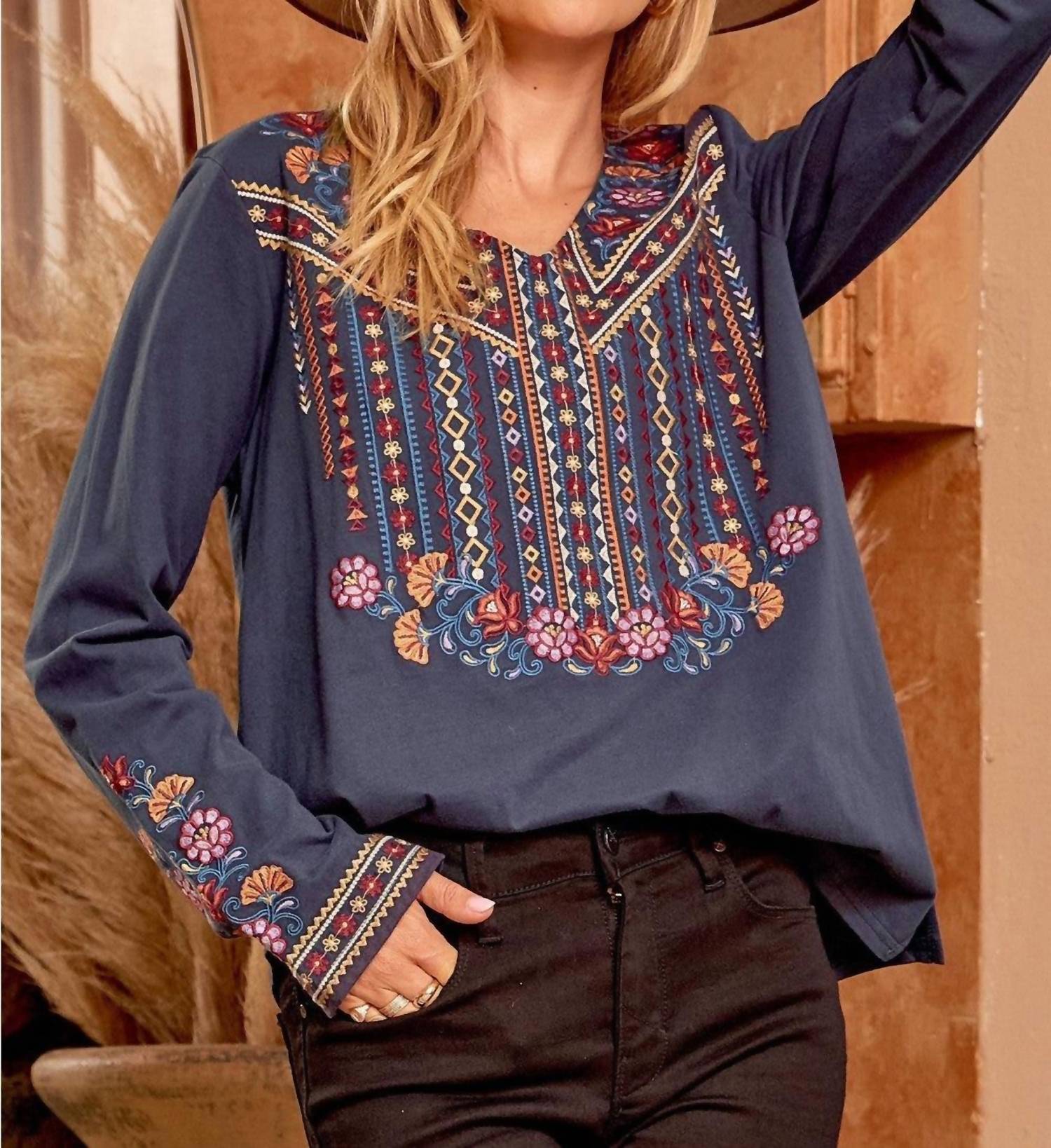 A timeless blouse that will never go out of style. Introducing the Embroidered V Neck Top by Andree By Unit, a striking piece crafted from 100% lightweight cotton for a comfortable and airy feel. This midnight blue blouse boasts long sleeves and vibrant embroidery on the bodice and sleeves, perfectly offset by a stylish V-neckline. Closure type: Pull on. Length: Approximately 26 inches with a relaxed A-line fit and side slits for added flair. Care: Hand wash cold. Available sizes: Small (38" bust), Medium (40" bust), Large (42" bust).