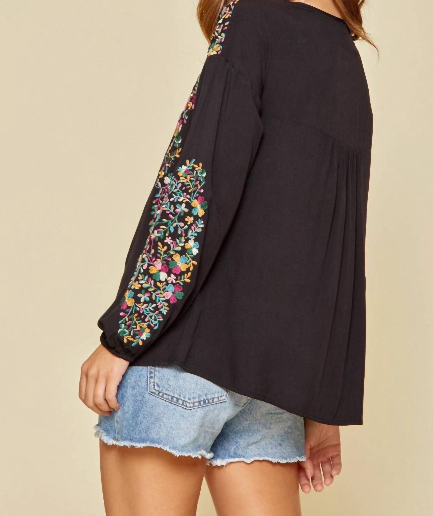 A timeless blouse that will never go out of style. Introducing the Floral Embroidered Top by ANDREE BY UNIT, a boho chic addition to your wardrobe. This black blouse features a scoop neckline, long balloon sleeves, and a relaxed A-line fit with a flowy bodice for a flattering silhouette. Crafted from 100% woven rayon, this piece is perfect for holiday parties or summer outings and measures 26" in length. Closure: Pull on. Care: Hand wash cold. Available in various sizes, including Small (Bust 38", Length 26") to 3X (Bust 52", Length 27").