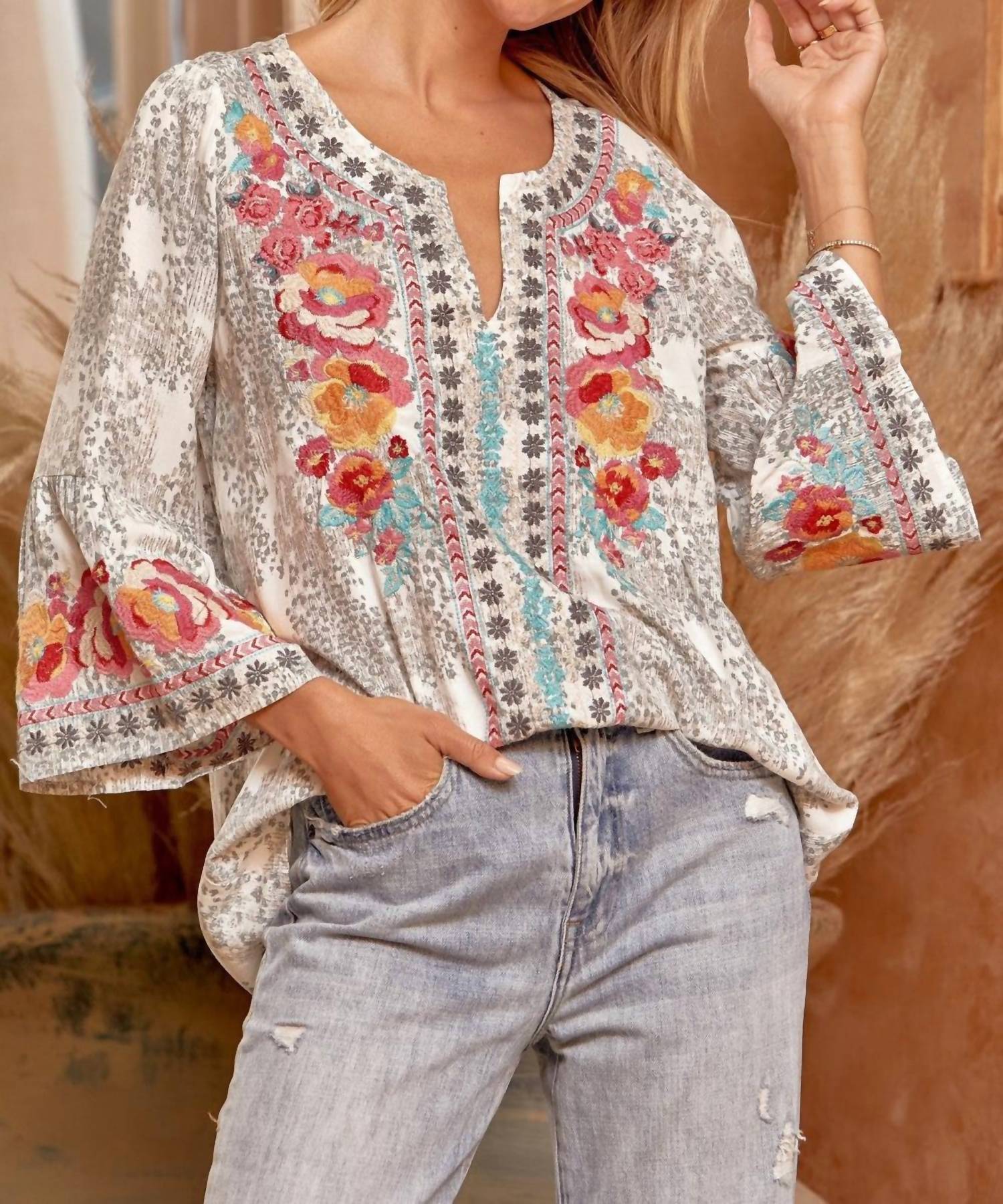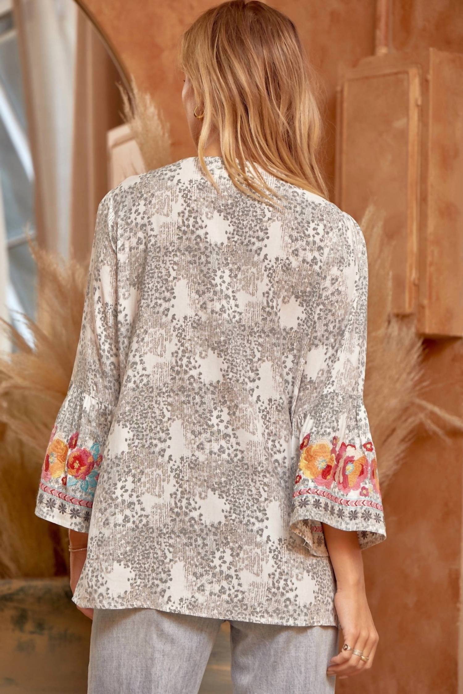 A versatile blouse that works from desk to dinner! Meet the South Beach Embroidered Leopard Top by ANDREE BY UNIT, a stunning blend of boho chic style and comfort in sage grey. This blouse features three-quarter bell sleeves and a relaxed A-line fit, with a beautifully split V-neckline enhanced by colorful floral embroidery. Crafted from 100% woven rayon, this piece offers a flowy silhouette with no stretch and a pull-on closure. Care: Hand wash cold. Available in multiple sizes with varied bust measurements, all maintaining a length of 27 inches for small through large, and 29 inches for 1X to 3X.
