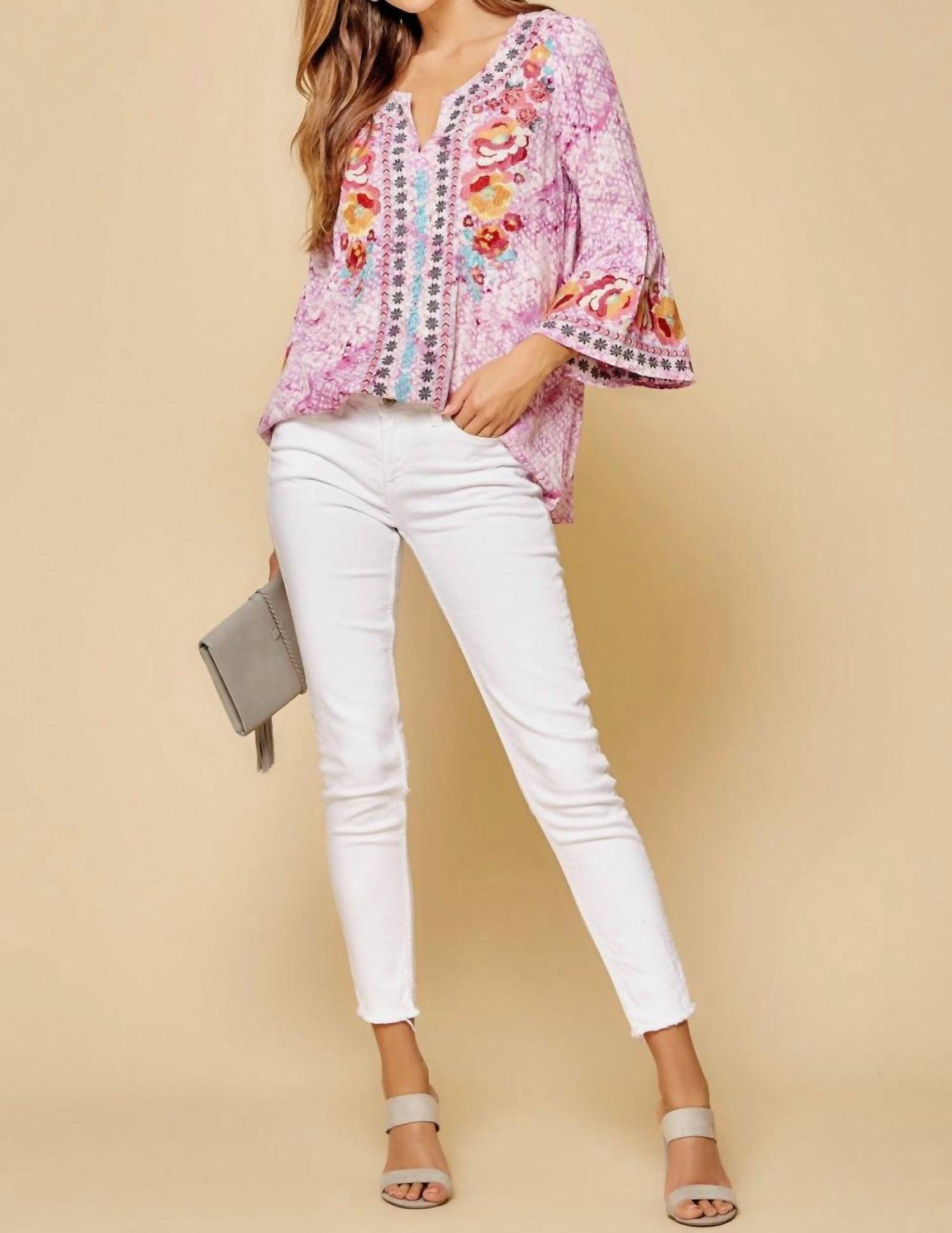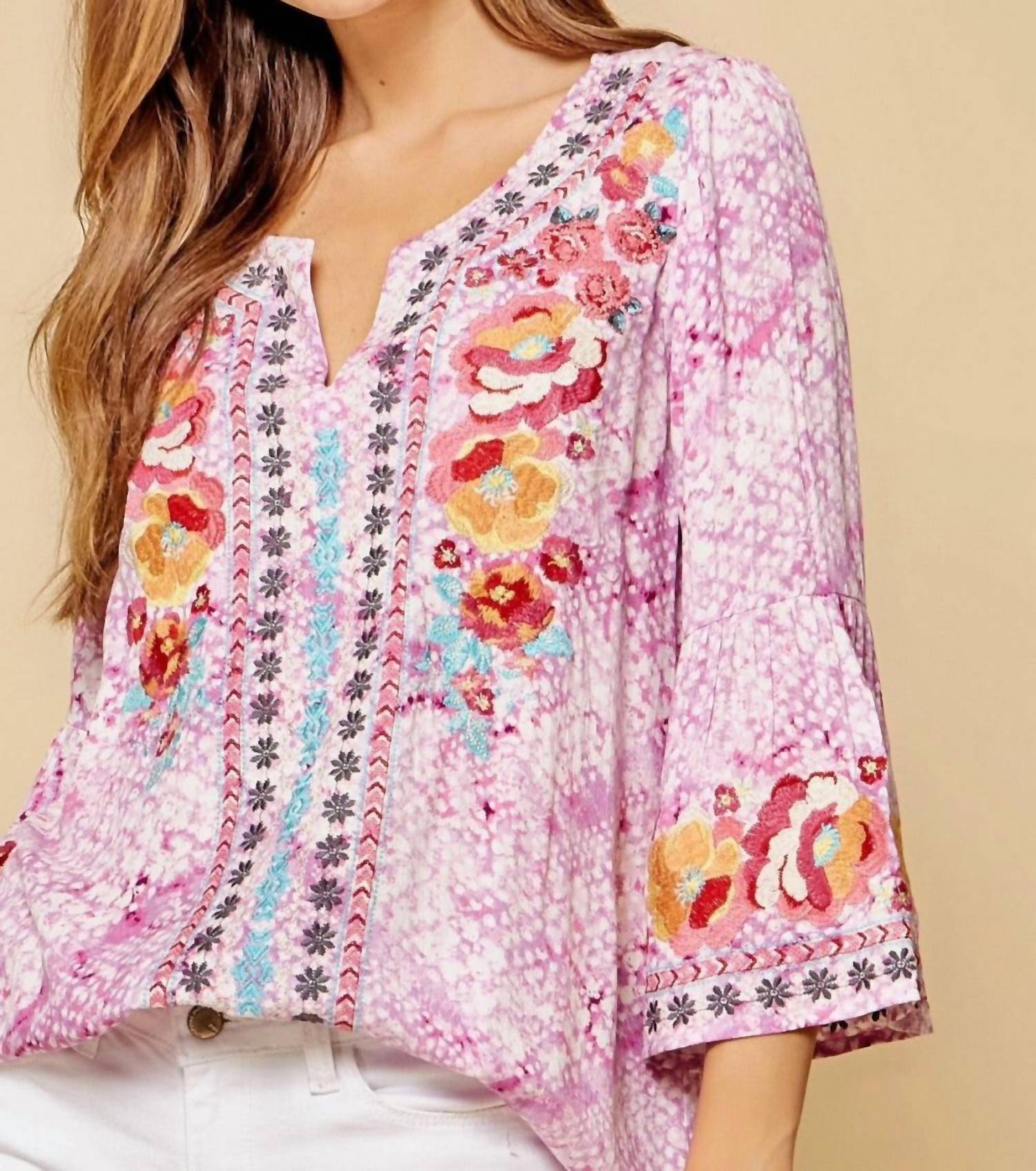 A versatile blouse that works from desk to dinner! Introducing the South Beach Embroidered Top by ANDREE BY UNIT, a boho chic addition to any summer wardrobe in a lovely lavender hue. This long sleeve blouse showcases an embroidered pattern with a split V-neckline and bell sleeves, offering a relaxed A-line fit at a garment length of 27 inches. Crafted from 100% woven rayon, the top is lightweight and perfect for a holiday party, featuring a pull-on closure for easy wear. Care instructions suggest hand washing to maintain its flowy elegance. Available in sizes with bust measurements: Small (40"), Medium (42"), Large (44").