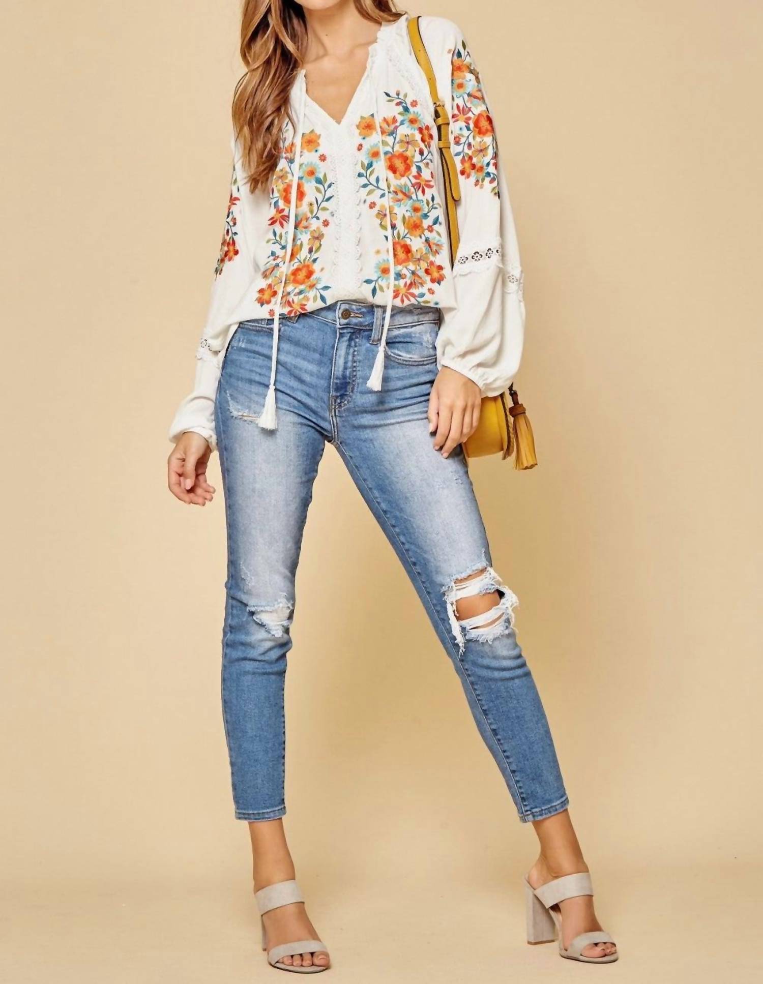 A timeless blouse that will never go out of style. Introducing the Tassel Tie Embroidered Top by ANDREE BY UNIT in an elegant ivory hue, perfect for a boho chic spring look. This blouse features long raglan sleeves with lace insets and elastic at the wrist, crafted from 100% woven rayon for a flowing, no-stretch fit. The 26-inch garment length and relaxed A-line silhouette offer a flattering fit, enhanced by beautiful floral embroidery. Closure: Tie closure. Care: Hand wash cold.