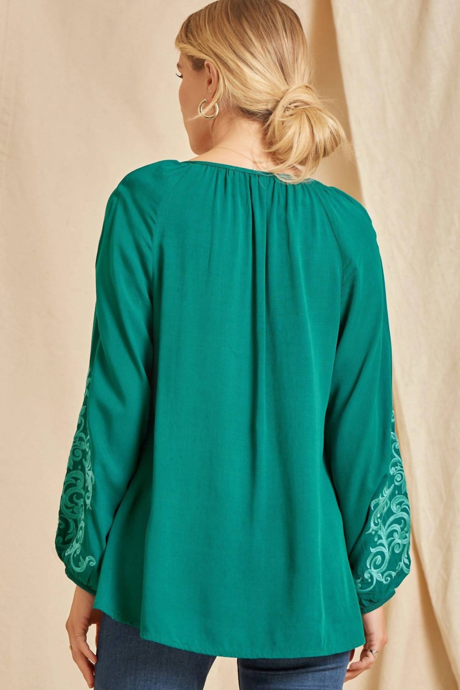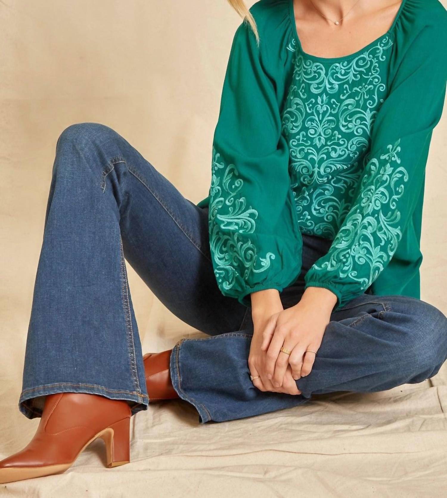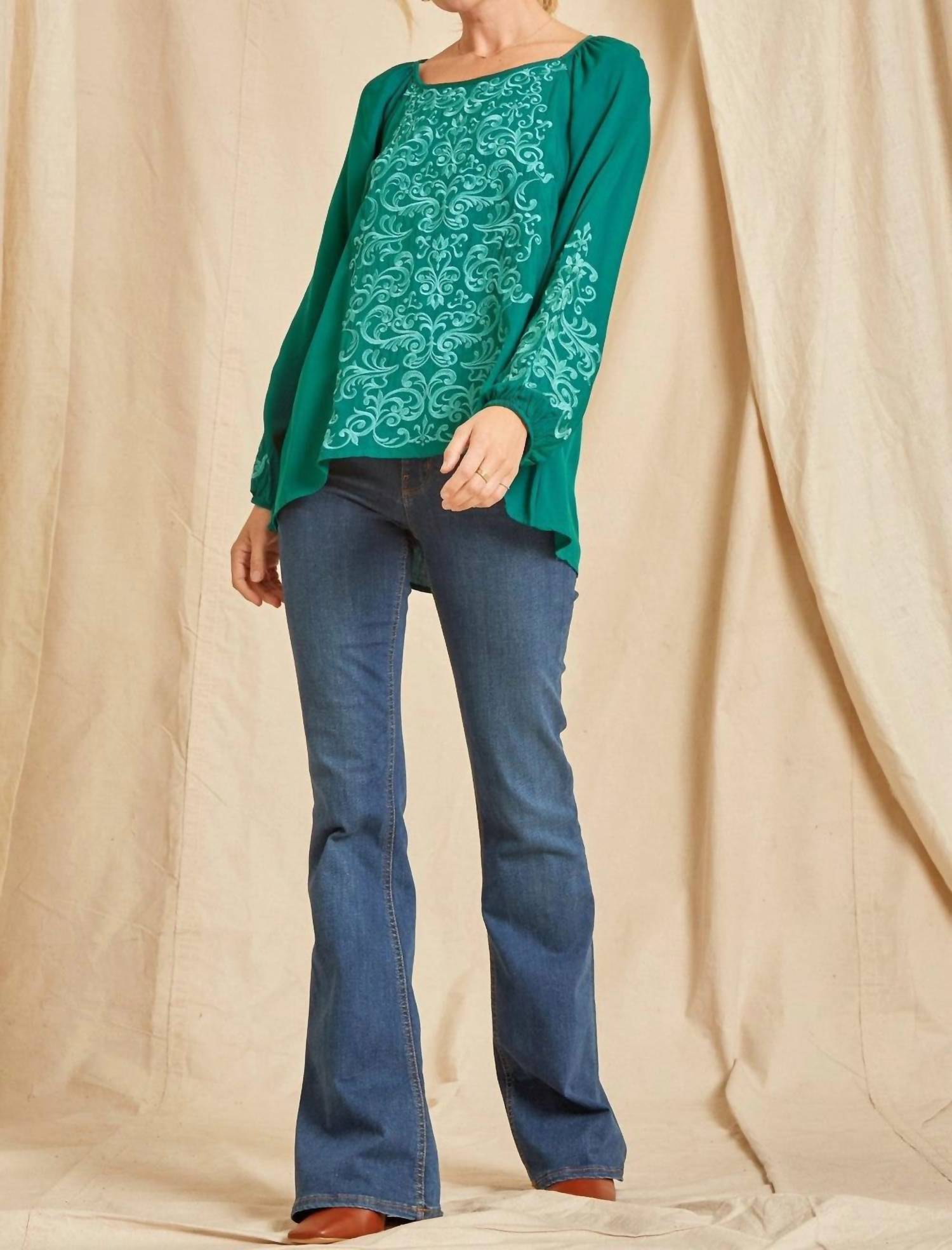 A timeless blouse that will never go out of style. Elevate your wardrobe with the Teal Tonal Embroidered Blouse by Andree by Unit, a must-have for a chic and timeless look. This patterned blouse boasts long sleeves with elastic wrists, a high-low hem, and a relaxed A-line fit, complete with a squareneck design perfect for an anniversary occasion. Crafted from 100% Rayon, it is lightweight yet durable with dimensions spanning Small Bust 38", L 26" to 3X Bust 52", L 28". Closure: Pull-on. Care: Hand wash cold, line dry.