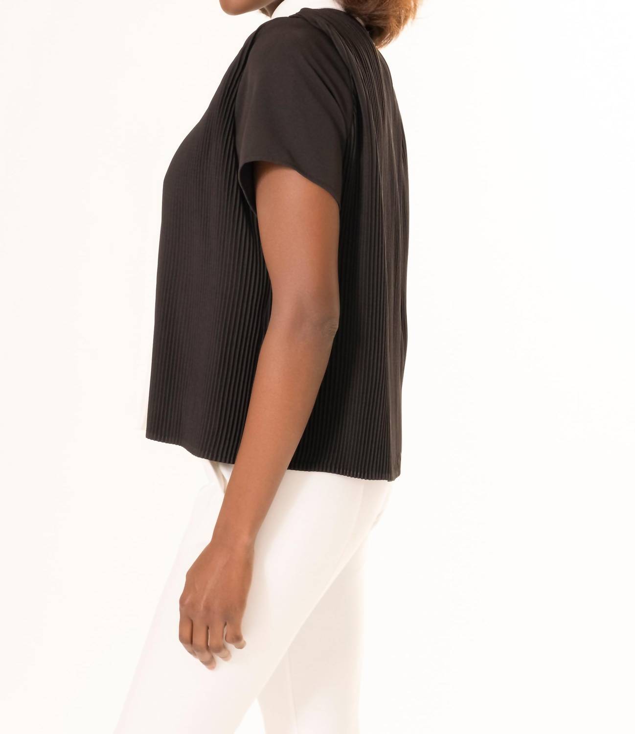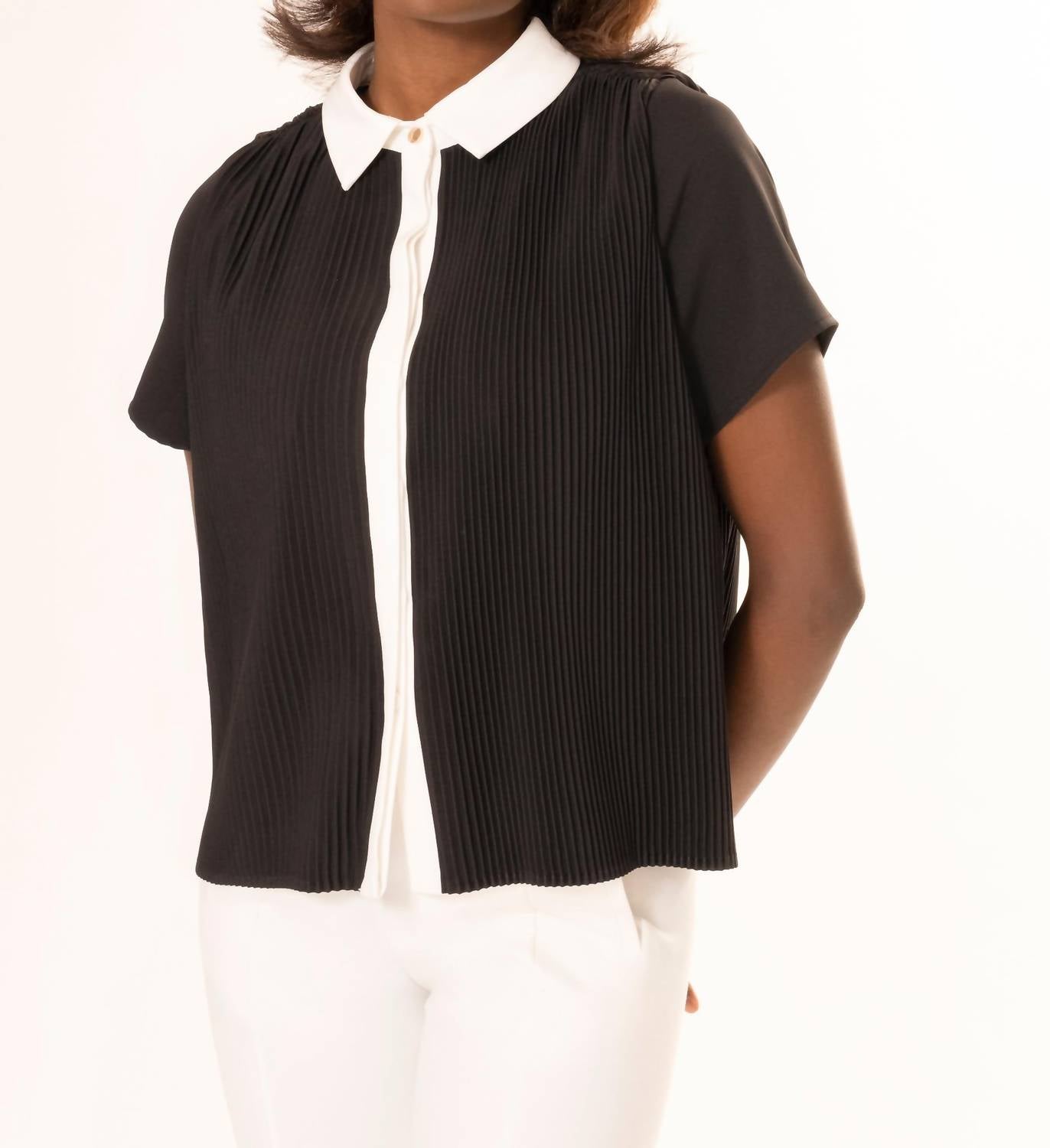 A timeless blouse that will never go out of style. The Trini Pleated Contrast Trim Collar Blouse from Area Stars is the embodiment of chic sophistication, designed to elevate any wardrobe. With its short sleeves and refined pleating, this blouse drapes elegantly and features a polished contrast trim collar. Its button closure adds to its tailored silhouette, making it a versatile piece for both work and play. Made for those who value elegance, it requires dry cleaning to maintain its pristine look.