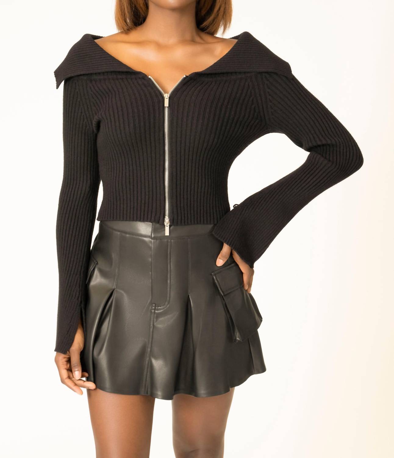 Show just the right amount of skin in the cutest sweater of the season. Discover the Area Stars Annelle Off The Shoulder Sweater, a refined addition to your monochrome wardrobe. This long-sleeved piece is crafted from a soft, ribbed blend of 49% Viscose, 29% Polyester, and 22% Polyamide, ensuring comfort and style. Featuring an off-the-shoulder neckline and a modern full front zip closure, this sweater transitions effortlessly from casual to chic. Care for it simply with machine wash instructions.