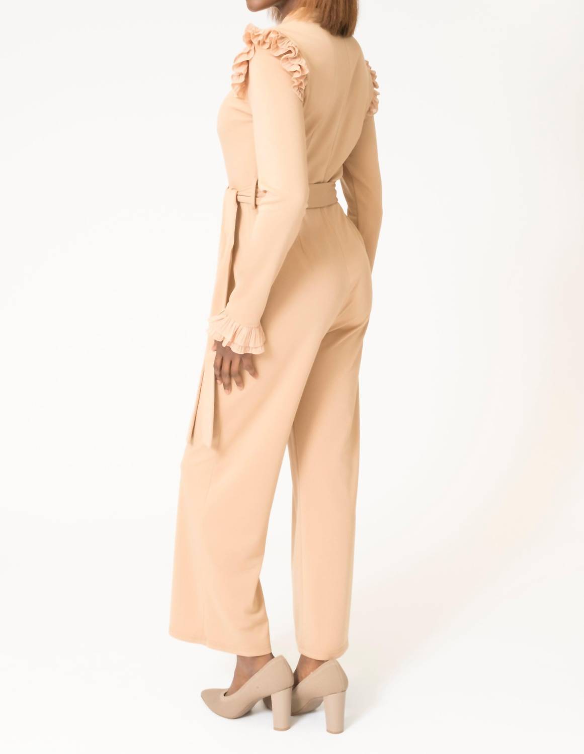It doesn't take much for this one piece to look effortlessly cool. Add some statement jewelry to dress it up, or throw on some sneakers for a more casual vibe. Introducing the Simone Knit Jumpsuit by Area Stars, a stylish beige outfit that epitomizes minimalist elegance. This jumpsuit features long sleeves with ruffled accents for a touch of femininity, and a V-neckline complemented by a mock neck collar for an elevated look. Composition: 95% Polyester, 5% Elastane. Care: Dry clean only. Perfect for vacation or special occasions, it offers a relaxed and comfortable fit with straight-leg and mid-rise waist design.