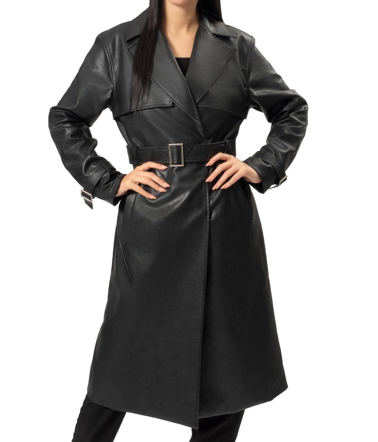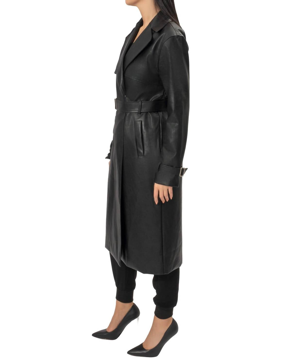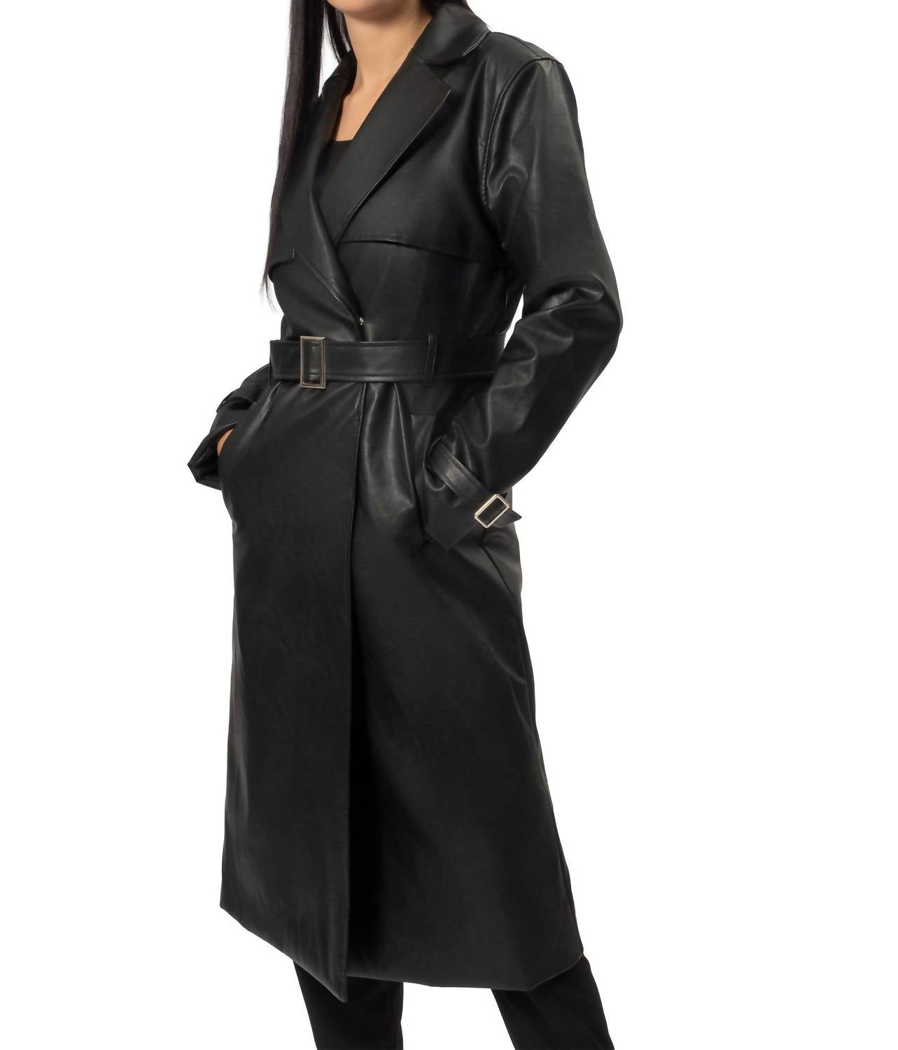 The perfect trench coat that you can throw over any outfit. The Riana Polyurethane Coat by Area Stars is an elegant addition to any fall wardrobe. Tailored for women, this black trench coat is crafted from 100% faux leather with a sleek solid pattern and long sleeves. Designed with convenience in mind, it features pockets and a pull-on closure, perfect for Thanksgiving travel. To maintain its polished look, hand wash and line dry are recommended.