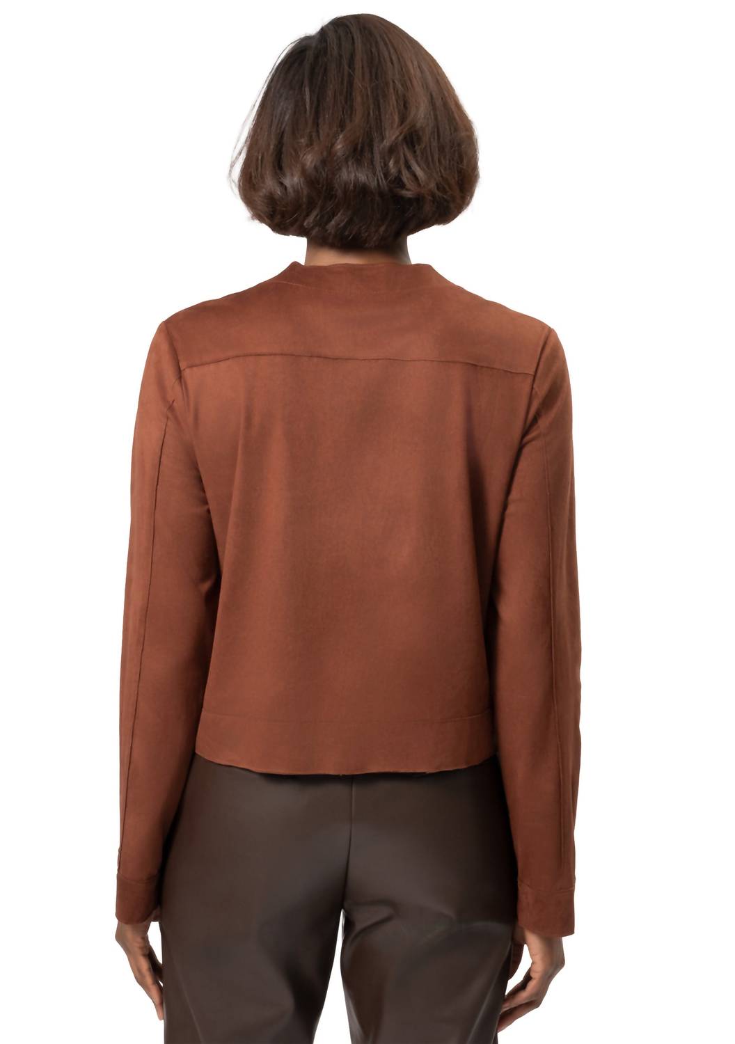 A casual yet cool jacket that every closset needs. Introducing the Marissa Faux Suede Jacket by Area Stars, designed for the modern minimalist seeking style and sophistication. This brown casual jacket features long sleeves and a crewneck, perfect for a chic fall evening event like Thanksgiving. Made from high-quality faux suede, it offers a solid pattern with functional pockets and a convenient button closure. Care: Dry clean only.