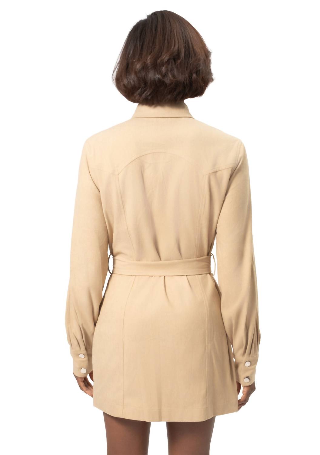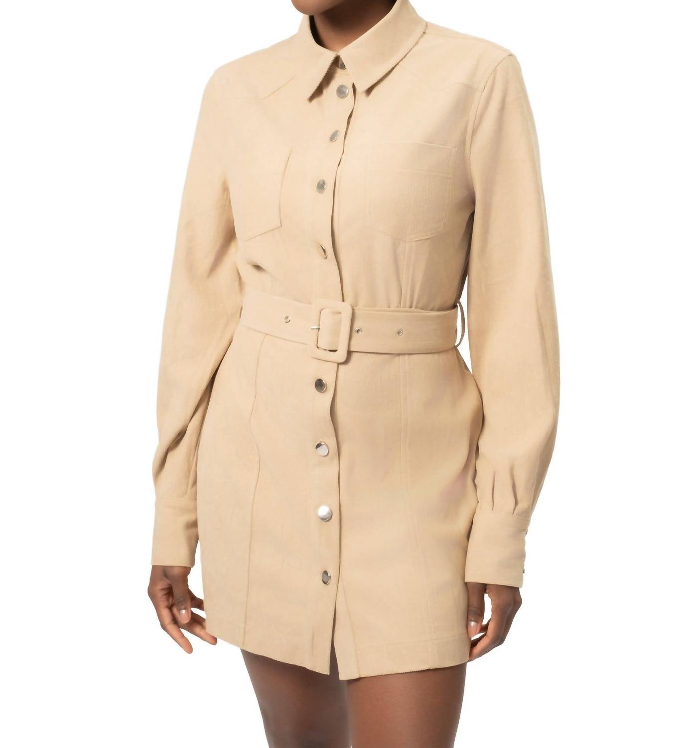 The kind of easy and flattering dress you'll be reaching for all season long. Introducing the Sosi Mini Dress by Area Stars, a timeless shift dress that evokes 90s fashion. Ideal for Thanksgiving and fall events, this dress features a classic collar and long sleeves in a solid tan hue. Crafted entirely from polyester, the dress offers a sleek silhouette without pockets. Closure is facilitated by a button closure, and it requires dry cleaning for upkeep.