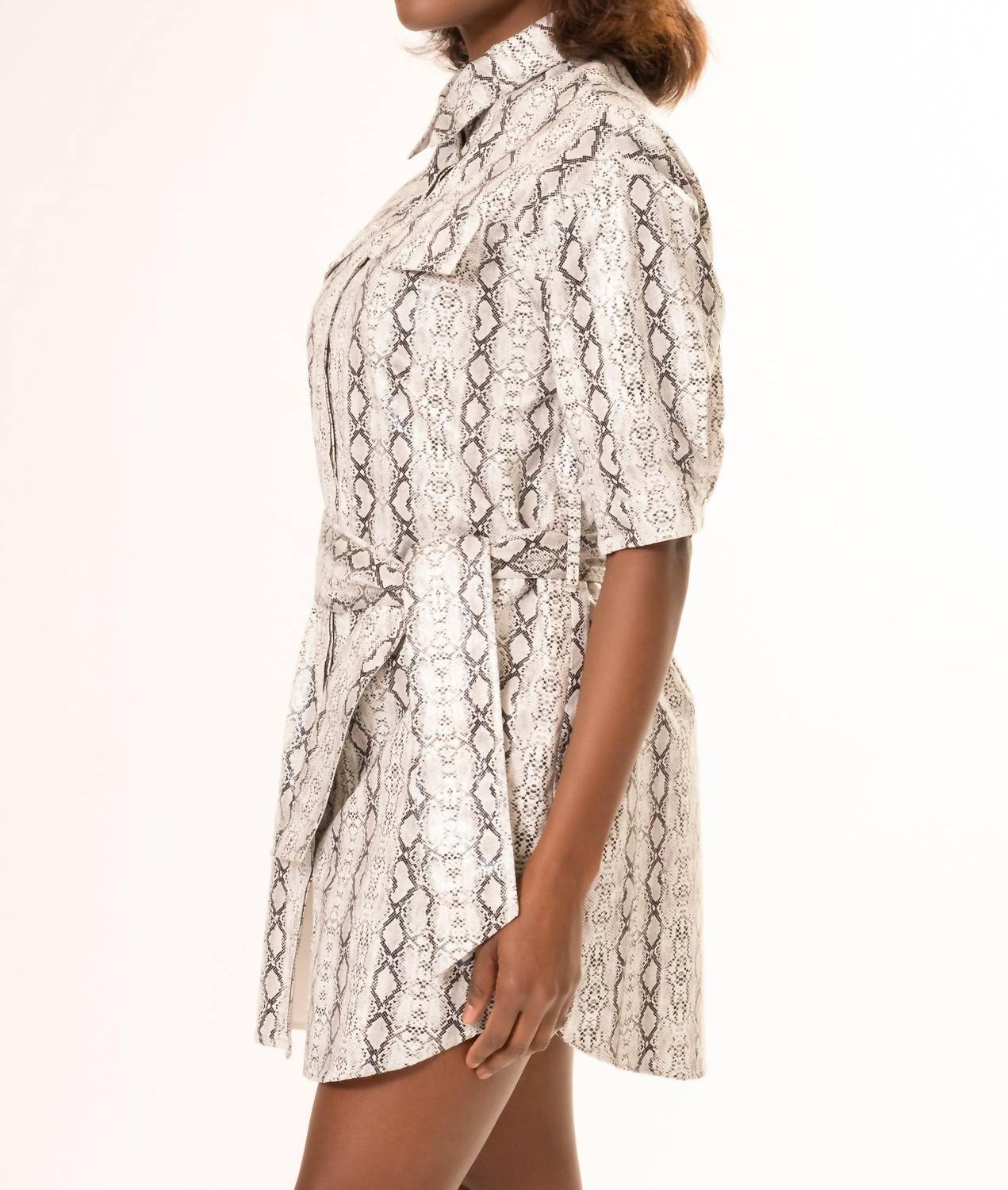 The kind of easy and flattering dress you'll be reaching for all season long. Introducing the Genny Snake Dress by Area Stars, a captivating mini dress in a striking beige snake print perfect for maximalist trends this spring. Featuring elbow-length sleeves, a flattering belted waist, and a collared neckline, this shirt silhouette dress effortlessly combines style with sophistication. Designed with practicality in mind, it includes convenient pockets. Ideal for vacation wear, this bold piece adds a chic touch to any wardrobe, effortlessly transitioning from daytime to evening occasions.