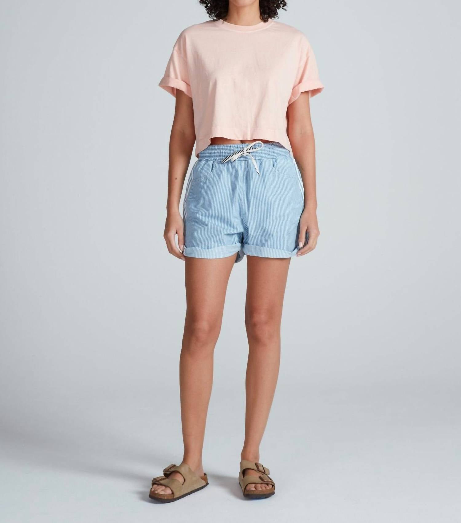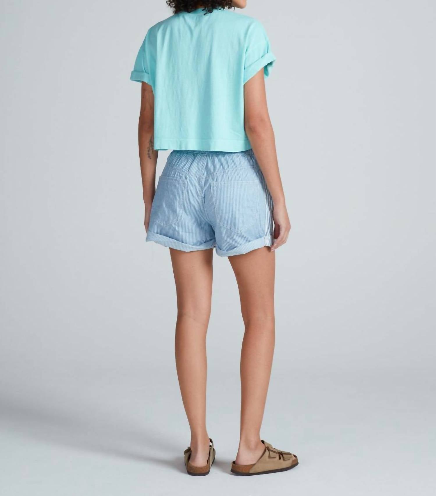 Tuck your favorite tee into these high-waist shorts for a more casual-cool feel. Elevate your summer wardrobe with the Cancun Short by ASKK NY, featuring a chic Blue Stripe design perfect for vacation vibes. These high-waisted shorts offer a pull-on style with an elastic waistband and tie, complemented by curved pockets at the hips for functionality. Made from 100% cotton in the USA, they boast a 13" rise, 2" inseam, and 26" leg opening. Care is simple with machine wash instructions, ensuring everyday comfort and style.