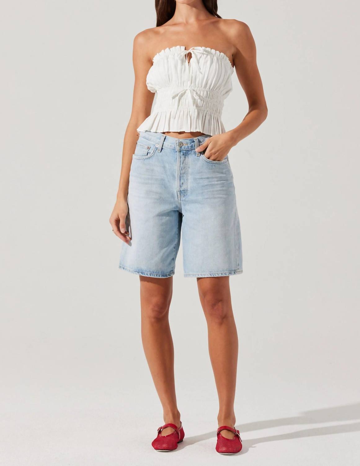 Pair this with your favorite jeans and slides for your next girls night out. The Biffy Strapless Top by ASTR, a sleek minimalist piece in a pristine white, is designed for your elegant occasions. This sleeveless blouse boasts a smocked tube top with a ruffle-trimmed and elasticized upper edge, featuring a drawstring tie front with a charming keyhole opening. Crafted from 70% Rayon and 30% Linen, the unlined top is a pullover style, designed with a slight peplum for added flair. Care: Dry clean only. Dimension details: Bust 25", Center Front Length 13 1/4". Model is wearing a size small (5'10" height).