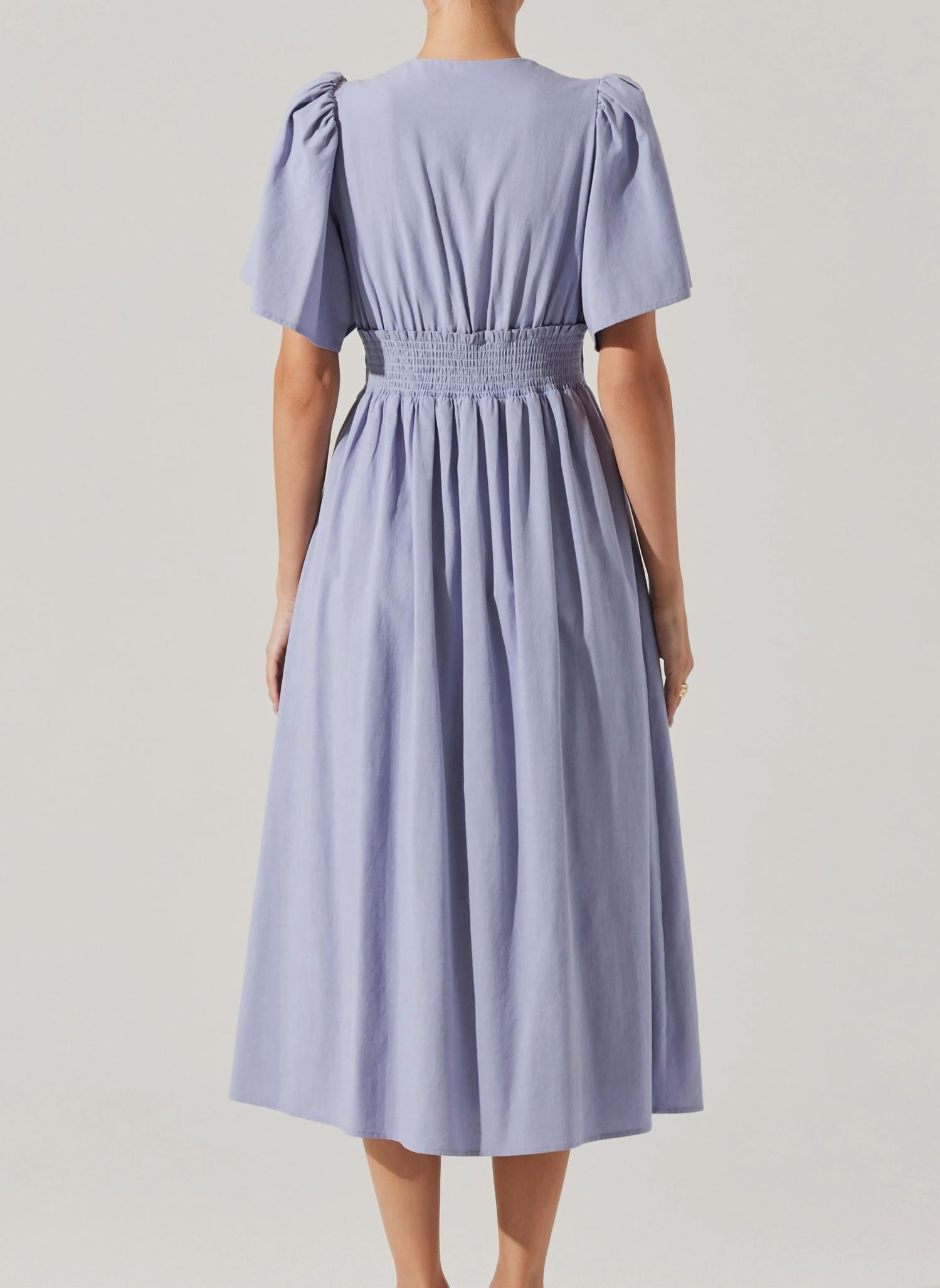 Just add slides or mules and you are good to go. Discover the Hadleigh Dress by ASTR, a delightful addition in periwinkle blue that effortlessly combines charm and bold style. This midi dress features short sleeves and a daring deep V-neckline, complemented by playful pleats and scalloped trims. Made from a 50% cotton, 50% rayon blend, it is designed with functionality in mind, offering a handy tie closure and practical side pockets. Crafted in China and lined for comfort, this dress is best maintained with dry cleaning.
