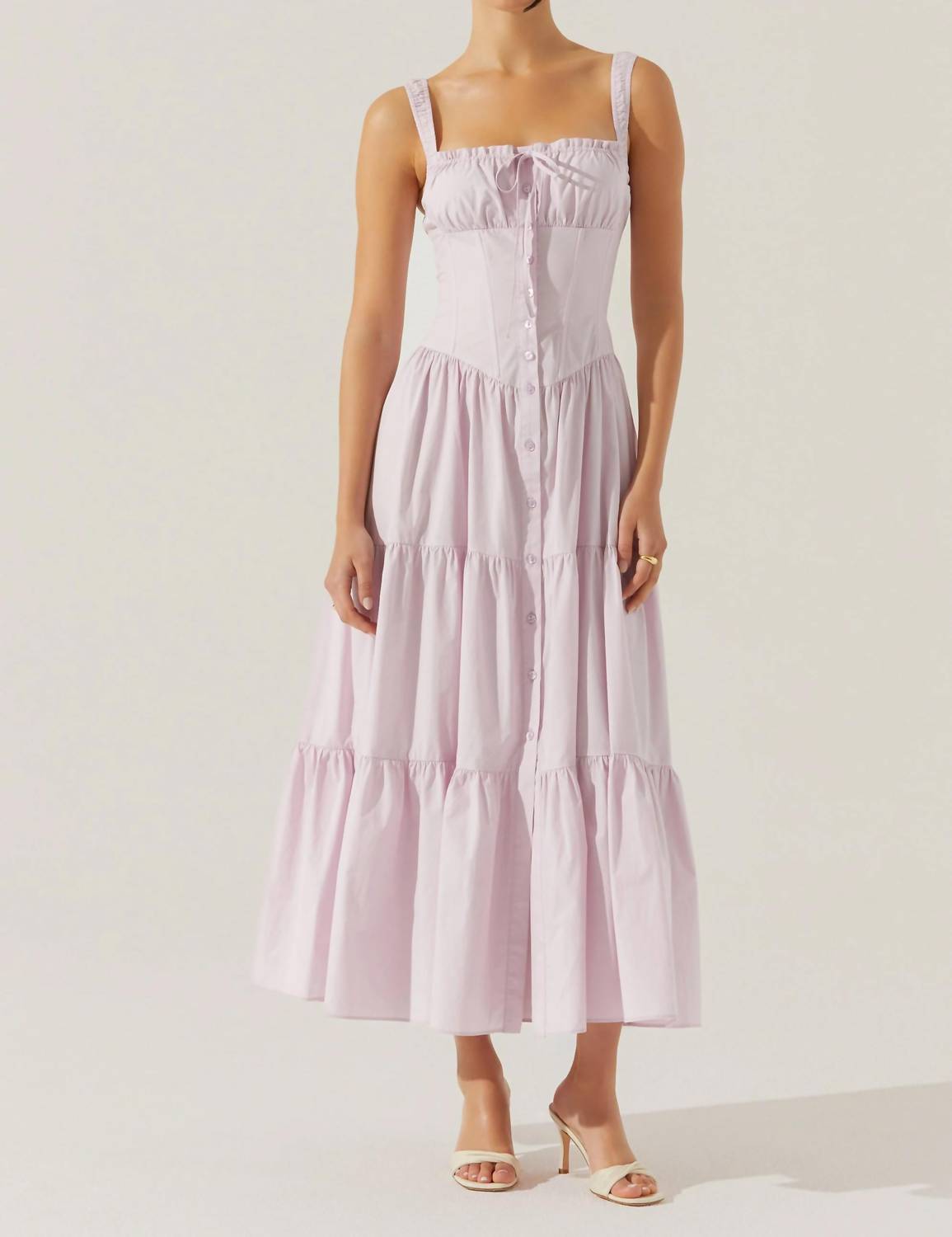 A maxi dress that is just as cute as it is comfortable. Experience timeless elegance with the Temperance Tiered Milkmaid Maxi Dress by ASTR, perfect for spring anniversaries. This sleeveless dress features a gathered bust with adjustable tie, elastic straps, and a square neckline. Crafted from 100% cotton for comfort, it boasts a full button front closure and intricate boning along the front and side torso, complemented by a smocked center back. For optimal care, dry clean only.