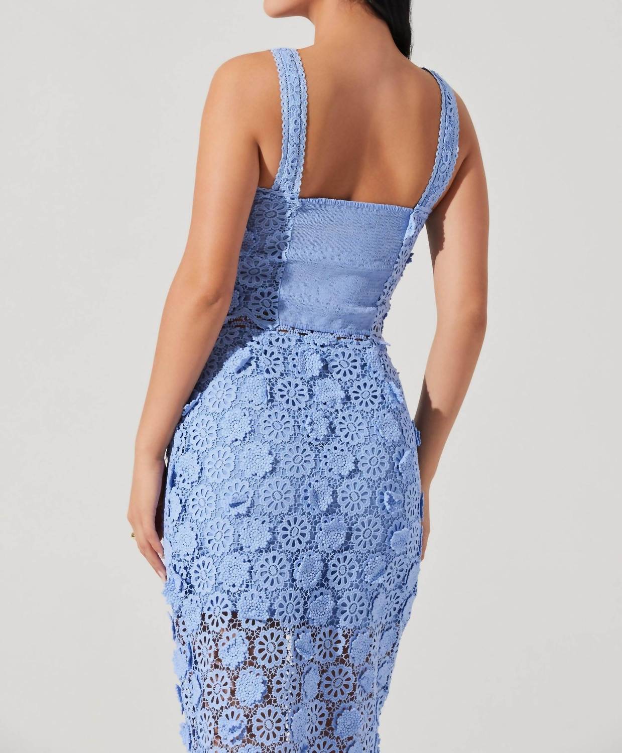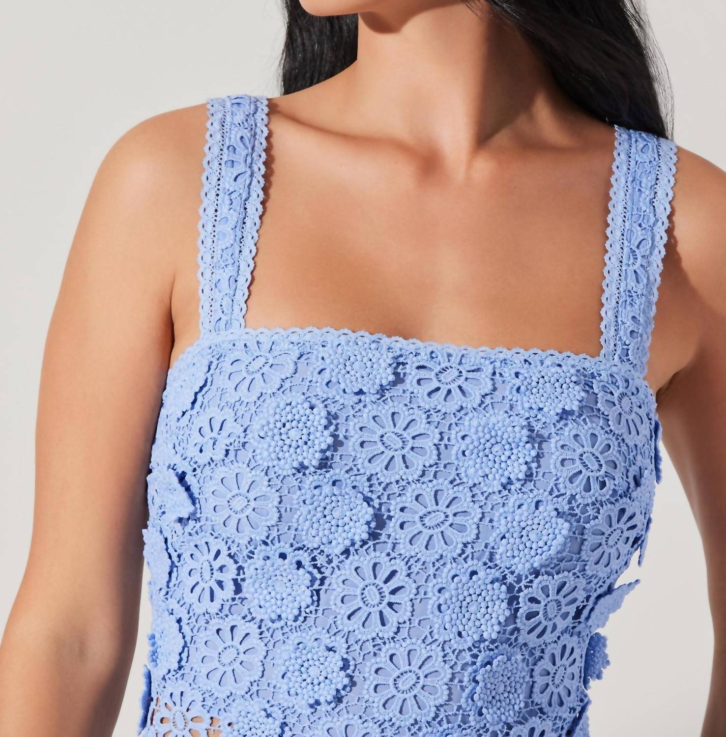 The perfect tank top for those warmer weather seasons. Introducing the Jonae Sleeveless Top by ASTR, a striking blue addition to your summer wardrobe. This top is sleeveless and crafted from 100% polyester, featuring stunning all-over 3D crochet floral details. The square neckline and scalloped trim at the neck and hem add a touch of elegance, while a concealed side zipper ensures a seamless silhouette. Care for this beautiful piece with dry cleaning to maintain its pristine condition.