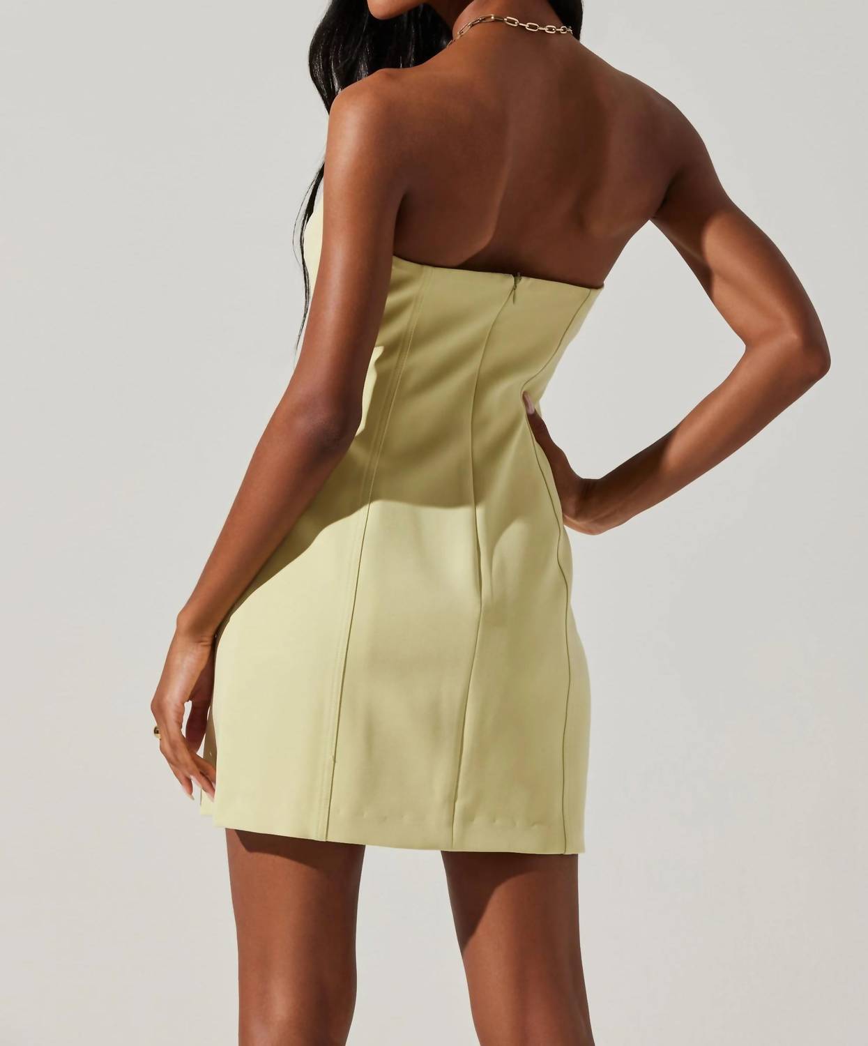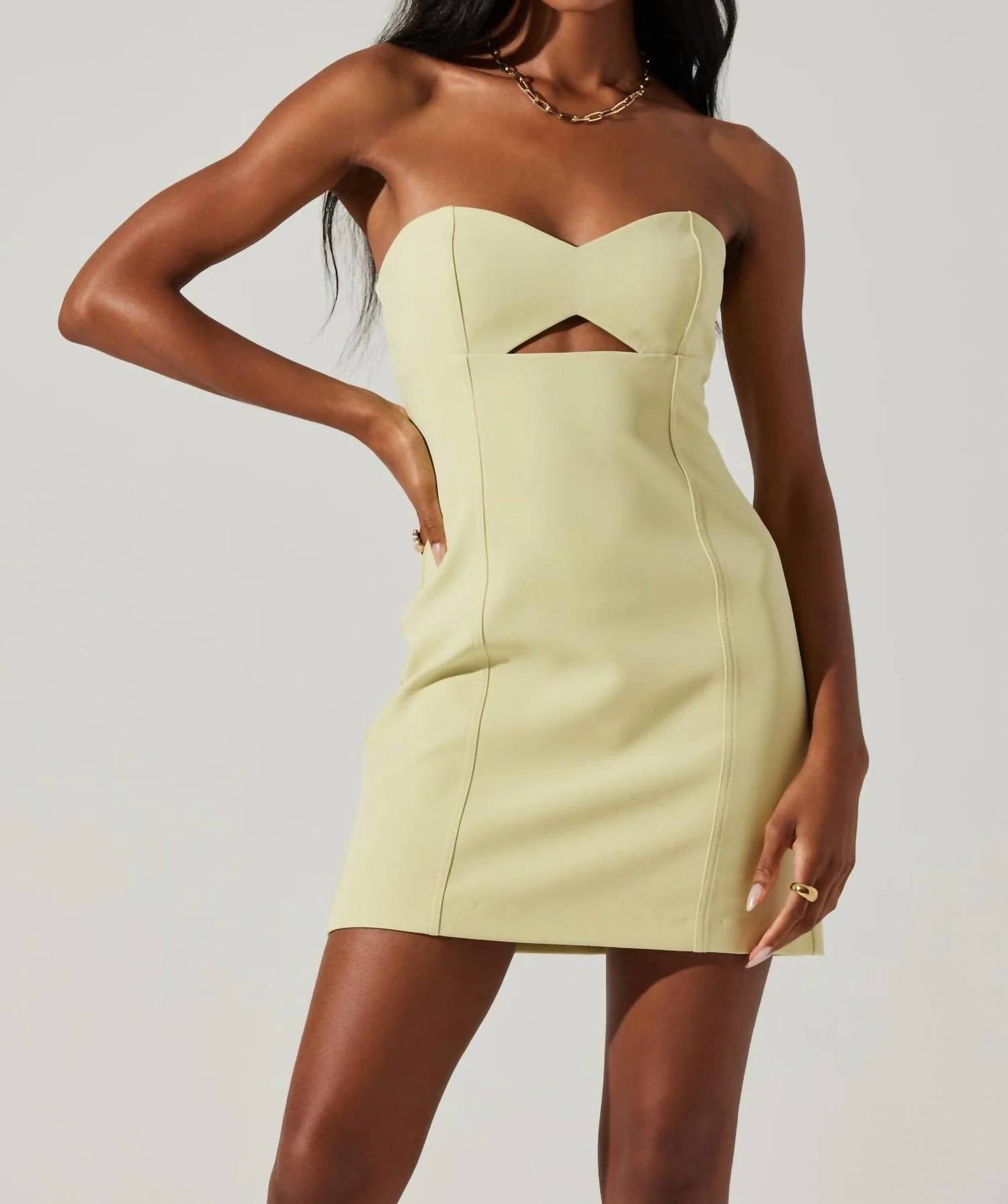 The kind of easy and flattering dress you'll be reaching for all season long. Discover the Mekhi Strapless Mini Dress by ASTR, a chic addition for your spring wardrobe in a vibrant lime hue. This minimalist shift dress features a striking triangle cutout under the bust and is fully lined for comfort. Crafted with 92% Polyester and 8% Elastane, complemented by a 100% Polyester lining, it offers a flattering fit with its zip closure. The dress measures 34 7/8" in length, with a bust of 31 1/2" and a waist of 27 1/4" for size small, and is perfect for evening events. Care: Dry clean only. Model is wearing size S (5'9" height).