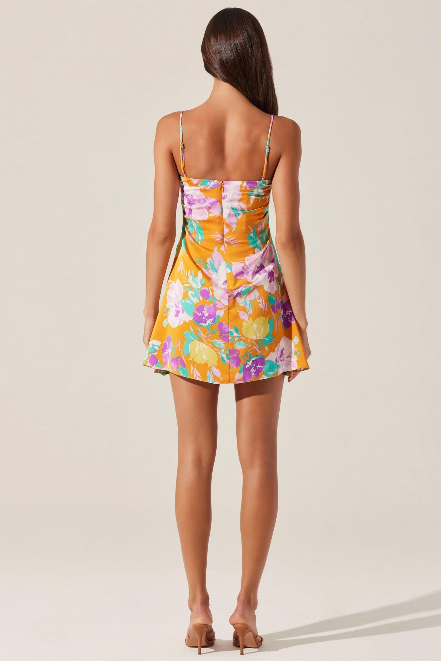 A short and breezy dress for those warmer days. Transform your event wardrobe with the Cerinthe Mini Dress by ASTR the Label, an eye-catching sheath style in vibrant orange multicolor. This sleeveless floral dress features a sweetheart neckline and adjustable spaghetti straps. The composition includes a luxurious blend of 100% polyester, with the lining adding a touch of stretch thanks to 3% elastane, all enhancing the flattering ruching along the sides. The concealed back zip closure ensures a smooth fit, while its 33" length is perfect for cocktail parties. Care instructions recommend dry cleaning for maintaining its elegant appearance. Model is wearing a size Small, standing 5'10" tall with a bust of 32 1/4" and waist of 28 1/2".