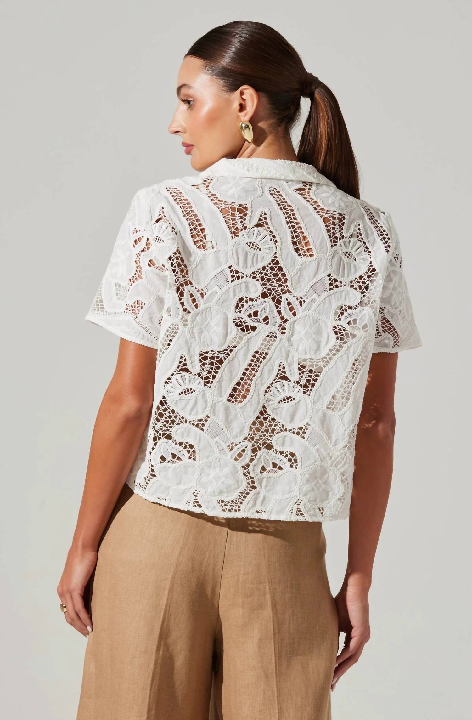 A versatile blouse that works from desk to dinner! Elevate your vacation wardrobe with the Tourist Top by ASTR, a chic white blouse designed for those casual, sunny days. This floral lace garment features short sleeves and a classic collar, offering a refreshing style. Crafted from 100% Cotton, it includes a front button closure for easy wear. Care: Dry clean only. Model is wearing size S with product dimensions: Length 21.5", Bust 41".