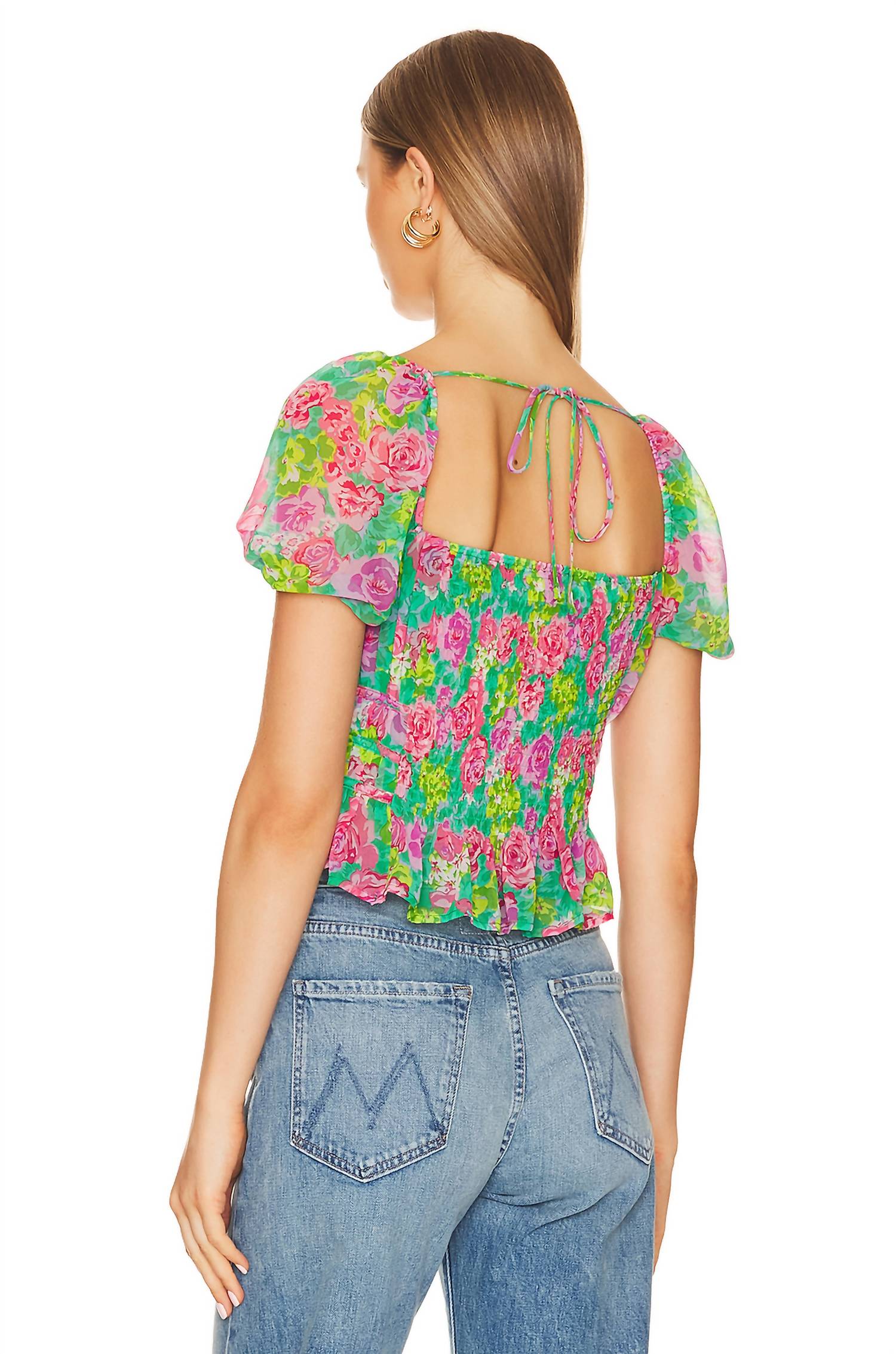 Presenting the Leigh Top by ASTR, a striking blend of colors and elegance for any occasion. Experience the charm of its short puff sleeves and sweetheart neckline, crafted from lightweight polyester chiffon with intricate pleated detailing. Closure is a tie at the back, highlighted by a wire trim at the bust for added structure. To maintain its vibrant floral design, hand wash and lay flat to dry are recommended.