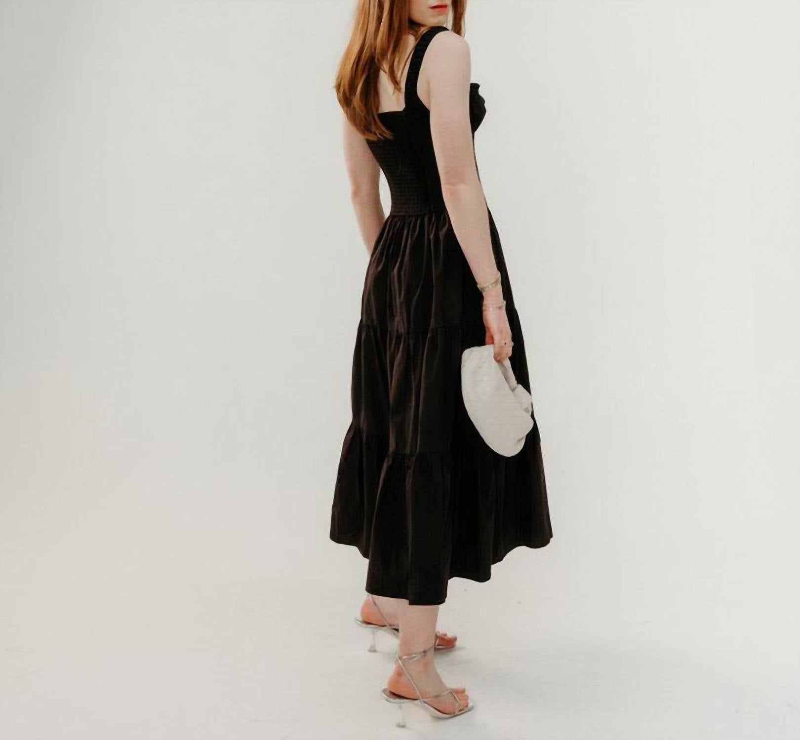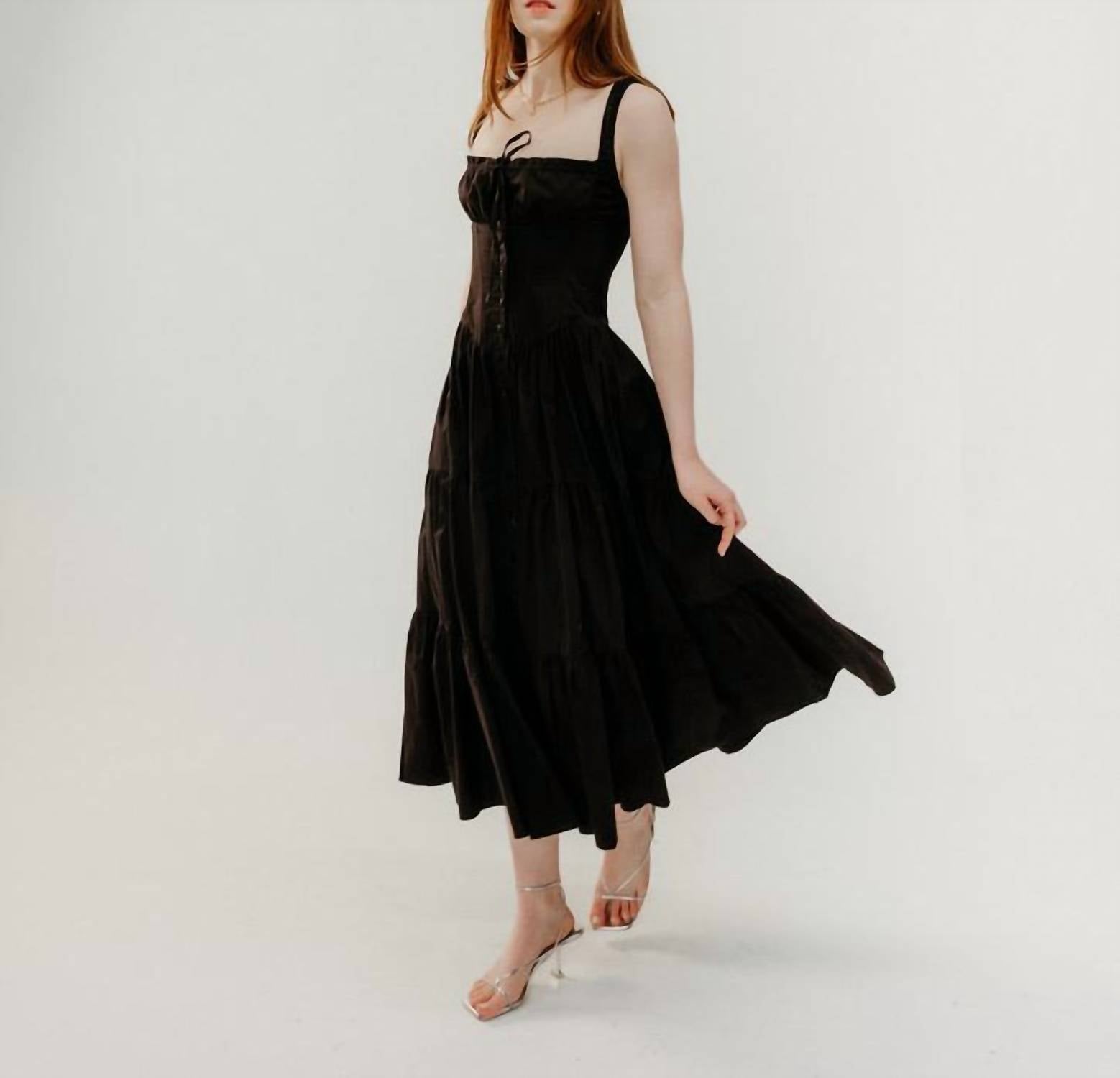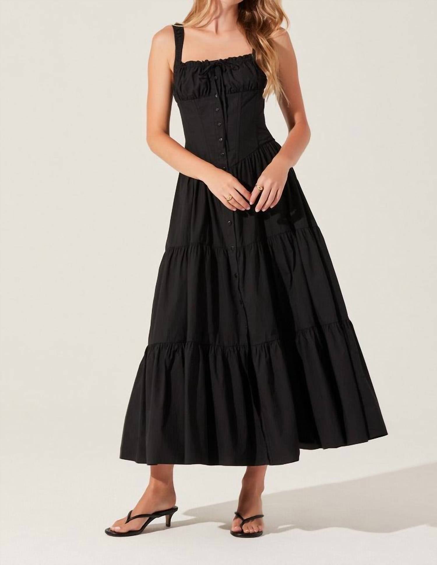 Cute and comfortable, this long sleeve dress has it all. Meet the Nicola Maxi Dress by ASTR, an elegant choice for your holiday party. This sleeveless, tiered milkmaid dress in solid black features a full button front closure and a flattering fit-and-flare silhouette. Made from 100% cotton, it offers comfort with elastic straps, a gathered bust with an adjustable tie, and supportive boning around the torso. This minimalist, sweetheart neckline dress is perfect for a spring season gathering, modeled here in size S by a 5'1" individual.