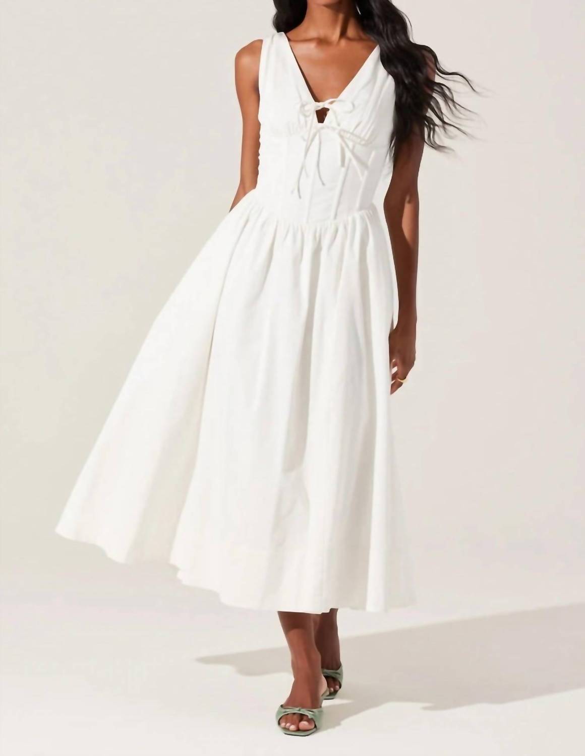 A midi dress so versatile, your options for wearing it are endless. Elevate your summer wardrobe with the Maili Midi Dress by ASTR, a perfect blend of quiet luxury and comfort. This sleeveless, solid white dress is crafted from a 97% cotton and 3% elastane blend, promising ease of movement. The dress features a flattering V-neck with lace-up detailing and structured boning throughout the bodice, complemented by a smocked back and functional side pockets. Originating from an unknown country, it secures with a concealed back zip closure and requires hand washing, with instructions to lay flat to dry for the best care.