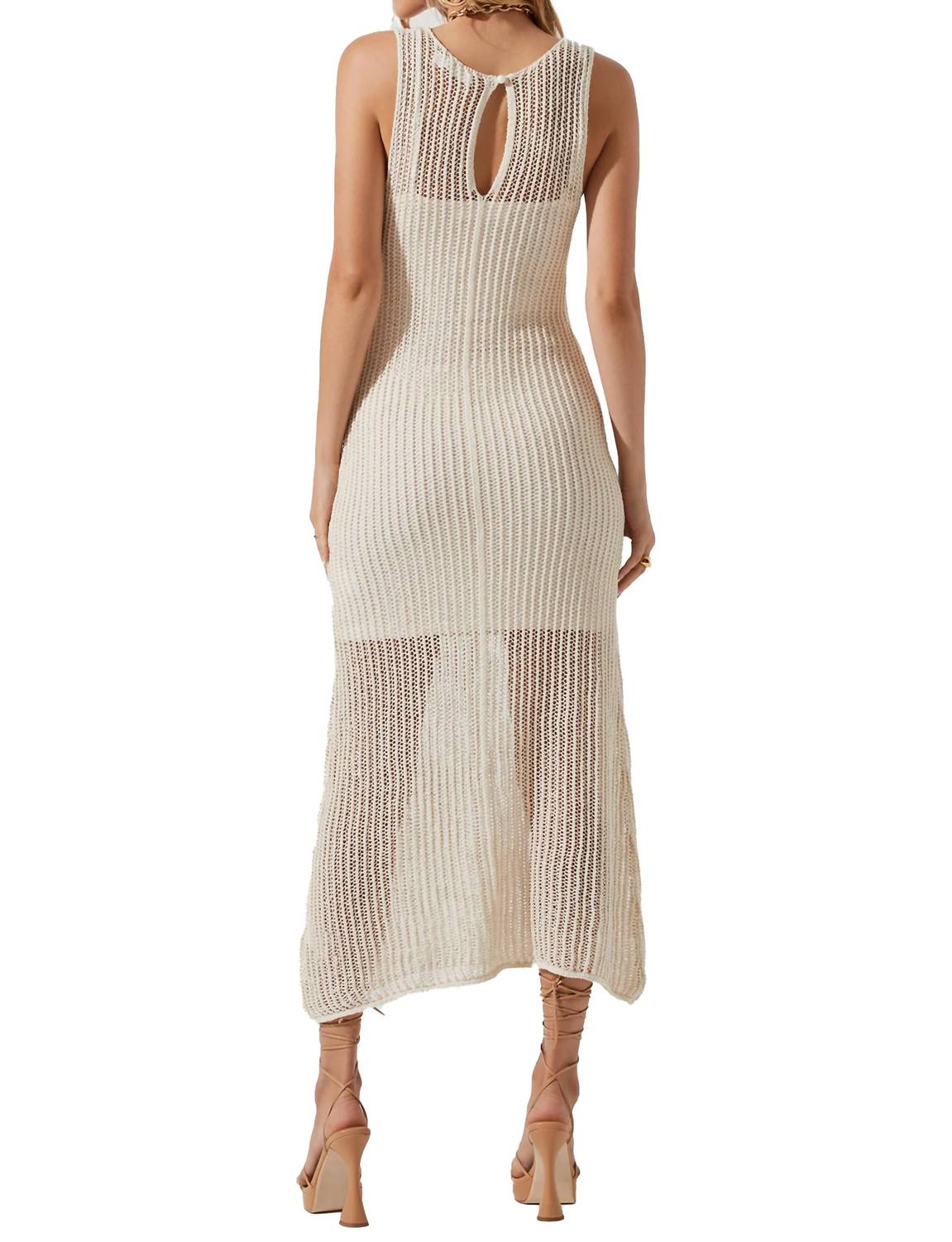 The perfect length dress does exist. The Palmer Crochet Midi Dress by ASTR the Label is a stunning blend of bohemian charm and elegant flair. This sleeveless dress, crafted from polyester, features a beautiful scoop neckline and a solid pattern in a natural hue. With a button closure at the nape of the neck, it offers a sleek column silhouette perfect for evening events or New Year's Eve celebrations. Care for this chic quiet luxury piece with dry clean only to maintain its refined appeal.