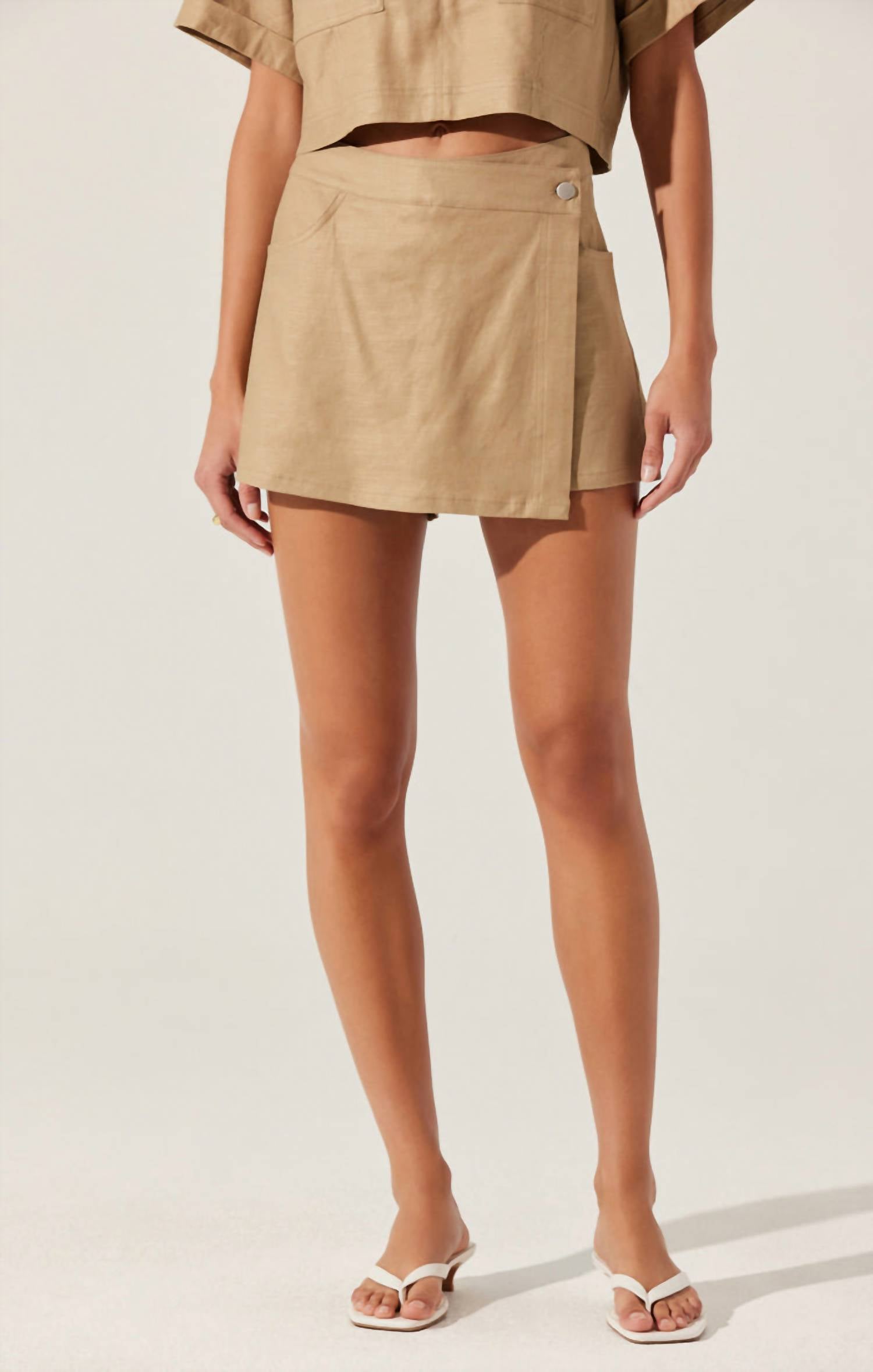 The go-anywhere and do-anything skort that you'll love to live in. Enhance your summer wardrobe with the Deborah Linen Blend Safari Skort by ASTR, available in a chic khaki hue. This women's skort elegantly combines the stylish appearance of a mini skirt with the built-in comfort of shorts, featuring a wrap front detail and a functional button closure. Crafted from a soft linen blend, it includes functional side and back patch pockets for practicality. Composition: 55% Linen, 42% Viscose, 3% Elastane with cotton pocketing. Closure: Concealed front zipper and button closure. Care: Dry clean only.