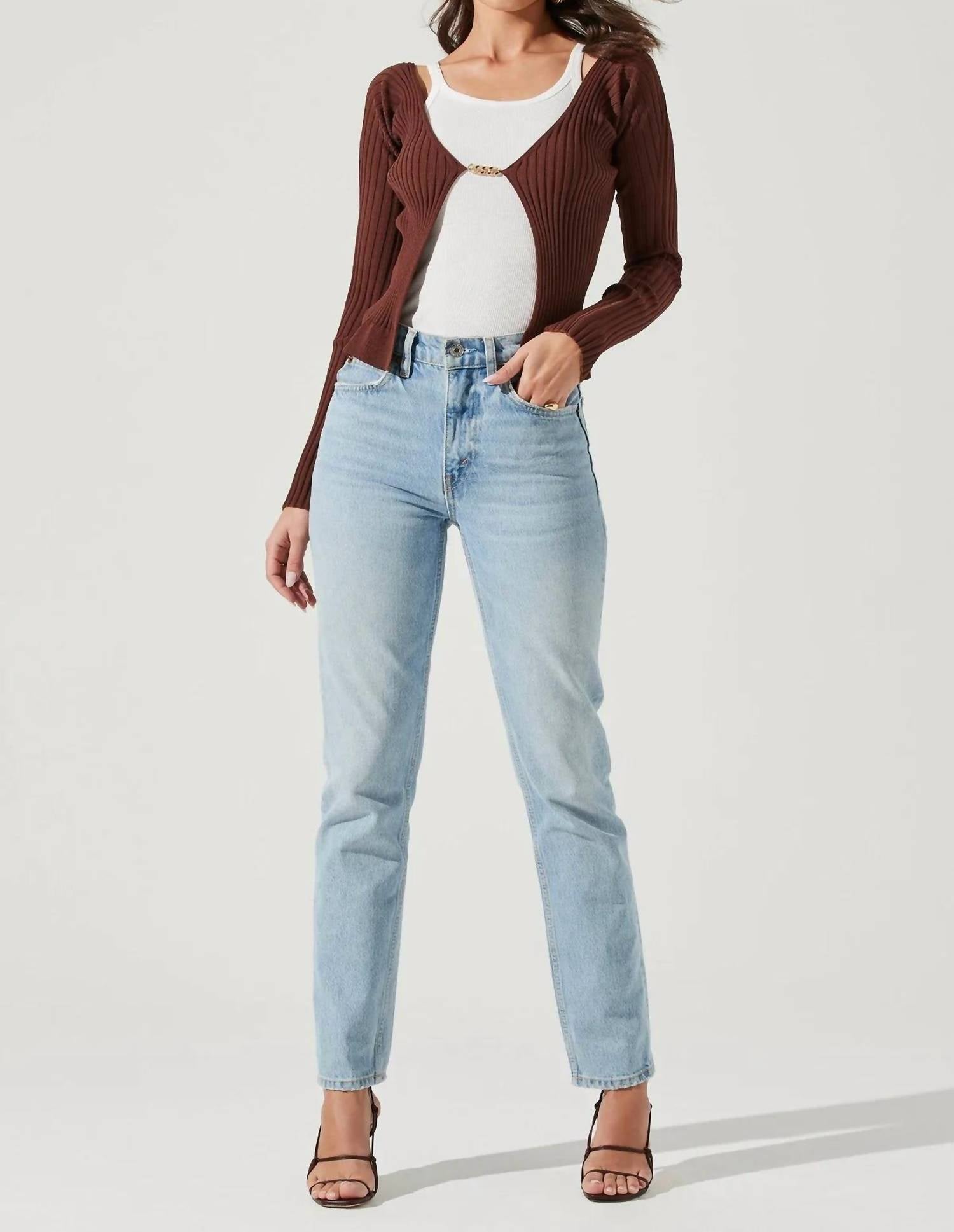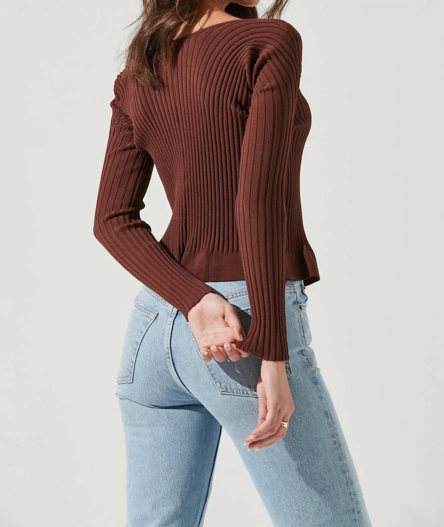 Throw this adorable cardigan over any cami or tank top. Elevate your style with the Angelique Cardigan by ASTR, featuring a sophisticated ribbed-knit construction. This brown cardigan offers a chic update with its long sleeves and a plunge V-neckline, complemented by a single chain link closure. Crafted from a comfortable viscose blend of 53% Viscose, 31% Nylon, and 16% Elastane, it provides a slight stretch for ease of wear. Perfect for minimalist trends and Thanksgiving dinner parties, this piece is a staple for any spring wardrobe.