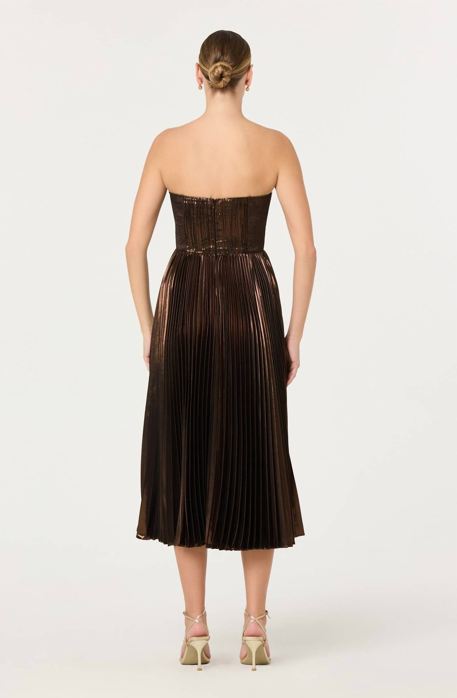 The perfect length dress does exist. The Ascella Pleated Midi Dress by ASTR is a sophisticated choice for special occasions in metallic brown. Crafted from 100% polyester, this dress features removable and adjustable spaghetti straps, a sweetheart neckline with knot detail, and a boned bodice at the sides with a smocked center back for a flattering fit. Garment length is midi, and it includes a concealed zipper closure for a seamless look. Care: Dry clean only.