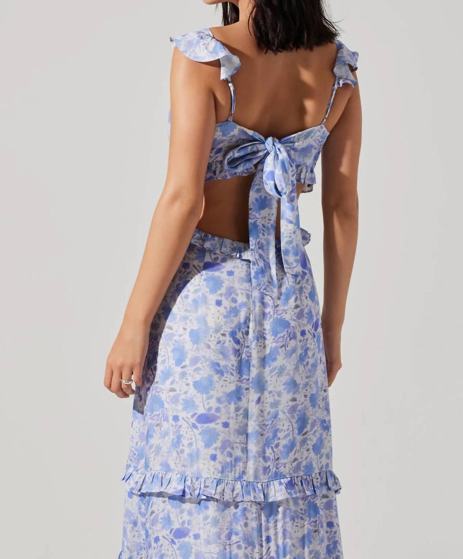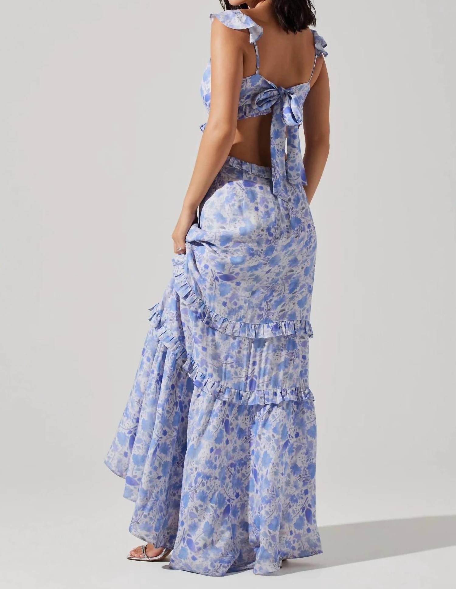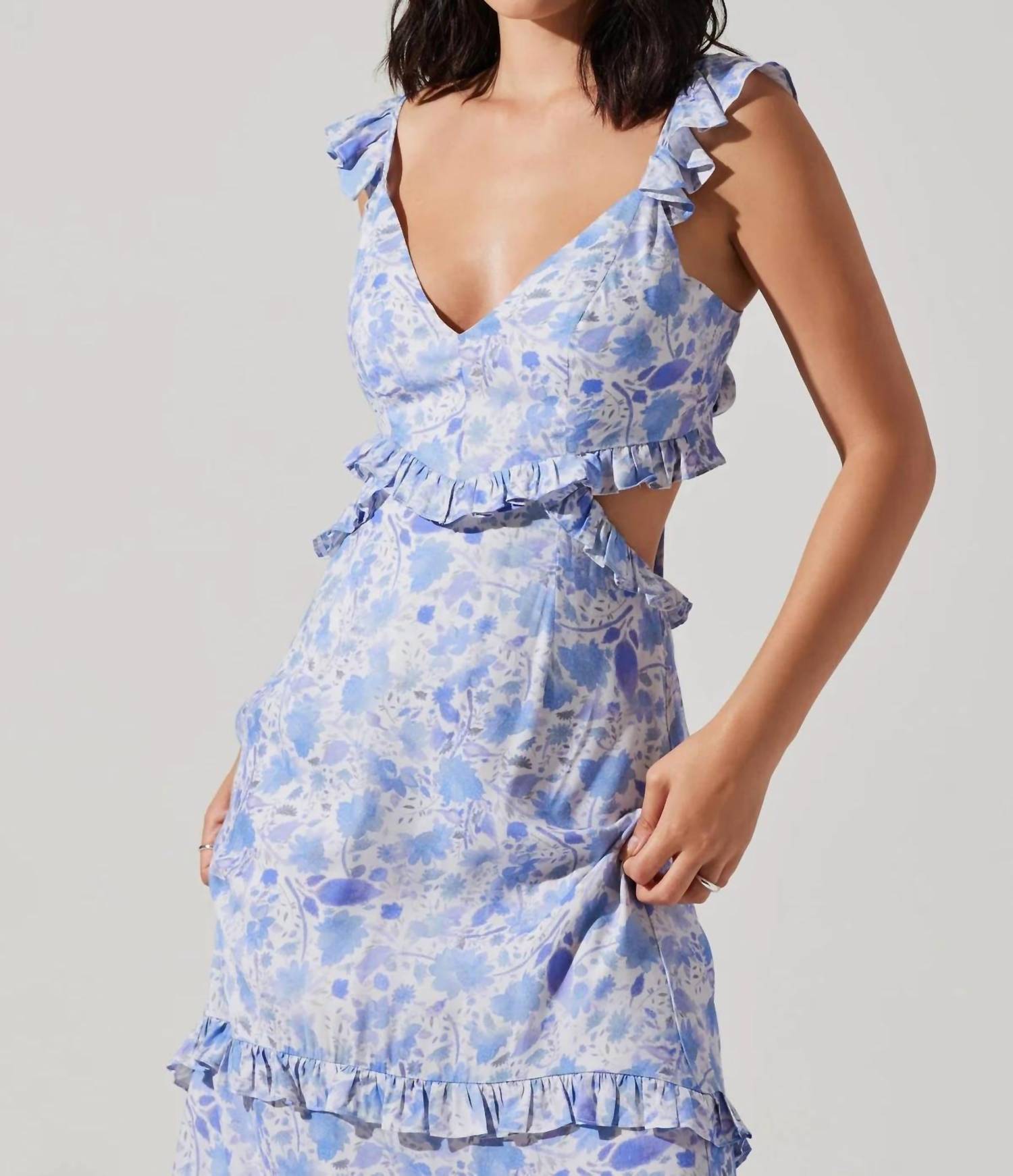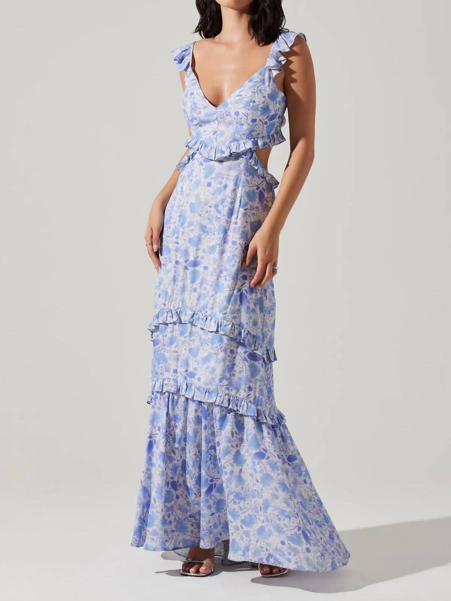 A maxi dress that is just as cute as it is comfortable. Introducing the Cassis Maxi Dress by ASTR, a stunning Boho Chic piece in a striking Blue Floral print ideal for any Spring occasion. This dress features elegant cap ruffle sleeves and a plunging V-neckline, with fashionable cutouts at the side and an adjustable tie back closure. It is composed of 100% Viscose with a lining of 100% Rayon, and includes slight boning at the bodice for a tailored fit. Length: 57 1/2". Closure: Concealed back zipper and tie closure. Care: Dry clean only. Model is wearing size S (5'8" height, Bust 34").