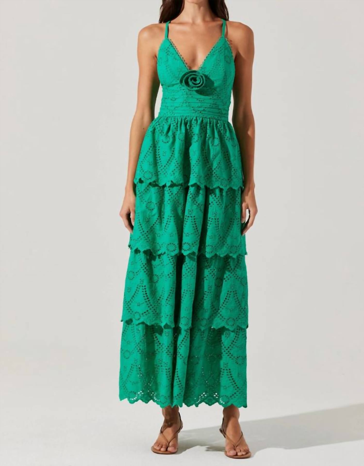 A maxi dress that is just as cute as it is comfortable. The Faeryn Eyelet Tiered Maxi Dress by ASTR is a striking choice for any special occasion with its spaghetti straps and captivating emerald hue. Crafted from 100% cotton with a rayon lining, this dress ensures comfort while exuding elegance through its eyelet detailing and floral rosette applique at the bust. Featuring a flattering A-line silhouette with a pleated waist and smocked center back, it has a V-neckline and a charming scooped back with crisscross tie straps. Closure: Zip closure. Care: Dry clean only. Perfect for weddings or spring celebrations.