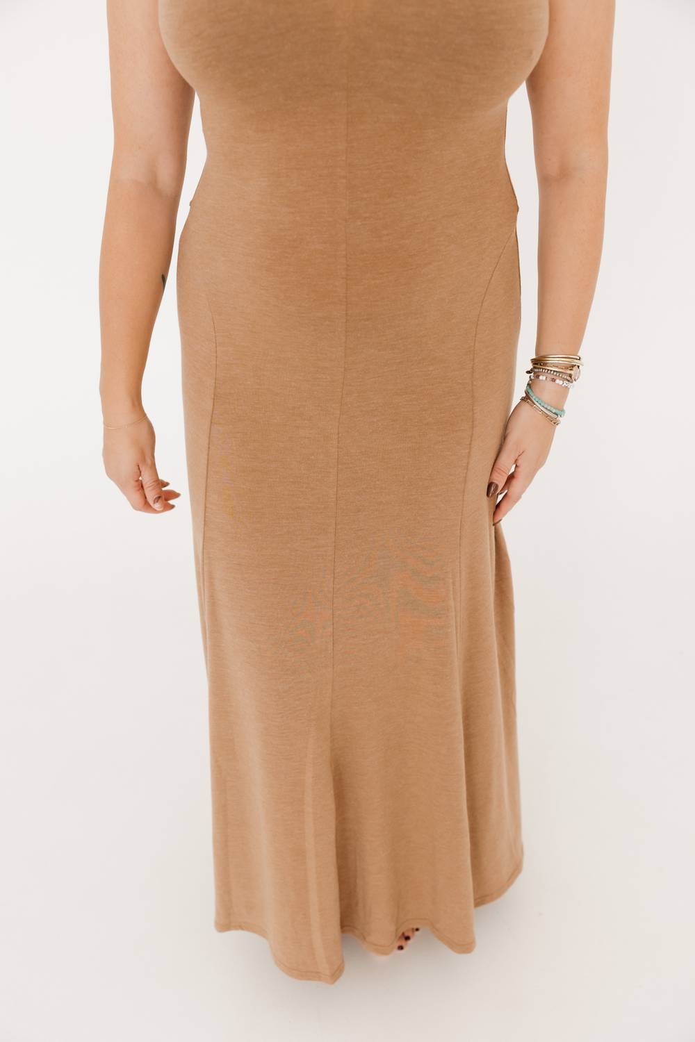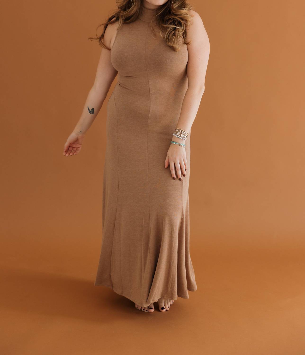 Who doesn't love a good maxi dress? This one you'll be reaching for season after season. Introducing the Haylie Maxi Dress by ASTR, the ultimate addition to your spring wardrobe for an evening event. This sleeveless dress boasts a chic mockneck design and a graceful A-line silhouette in a solid neutral brown. Crafted from 70% Polyester, 25% Rayon, and 5% Spandex, it offers a comfortable fit with a pull-on closure. Care for it easily with machine wash instructions, making it a versatile piece for any occasion.