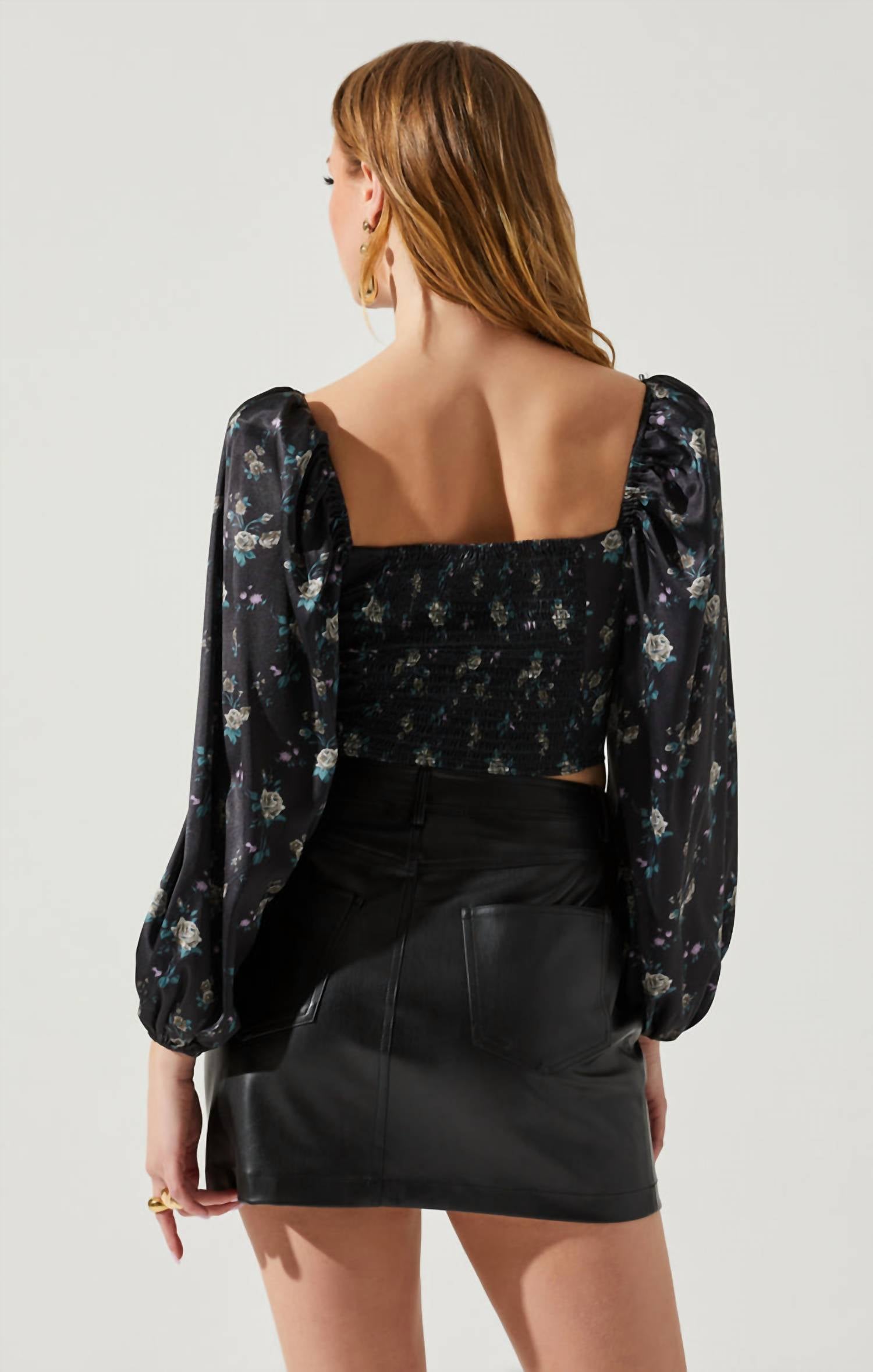 A versatile blouse that works from desk to dinner! Unveil sophistication and elegance with the Josephine Puff Sleeve Top by ASTR in a striking Black Floral pattern. Adorned with long puff sleeves, this piece boasts a sweetheart neckline and a corset bodice for a tailored look. The slightly cropped design is complemented by a smocked back with stretch and a convenient back zipper closure. Care for this delicate piece by opting for dry clean only.