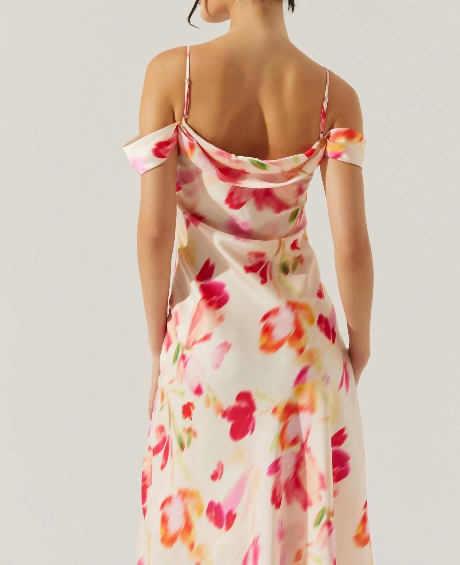 A maxi dress that is just as cute as it is comfortable. Step into elegance with the Kitura Cold Shoulder Maxi Dress by ASTR, beautifully designed in a Pink Watercolor floral print. Featuring spaghetti straps and fold-over draped sleeves, this slip silhouette maxi dress highlights a chic squareneck and a tastefully placed left leg slit above the knee. Made from 100% polyester with a partially lined finish, it ensures both style and comfort. Closure: Pull on. Care: Hand wash cold, line dry, and do not iron. Model is wearing a size S (5'9½" height) with dress dimensions: 55½" length, 31½" bust, 27" waist.