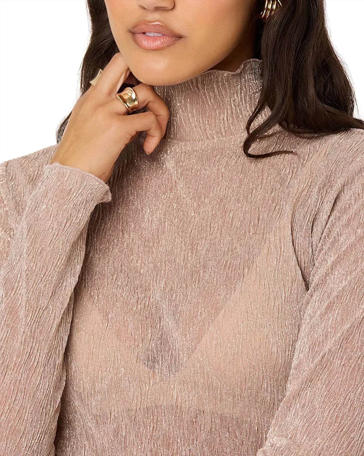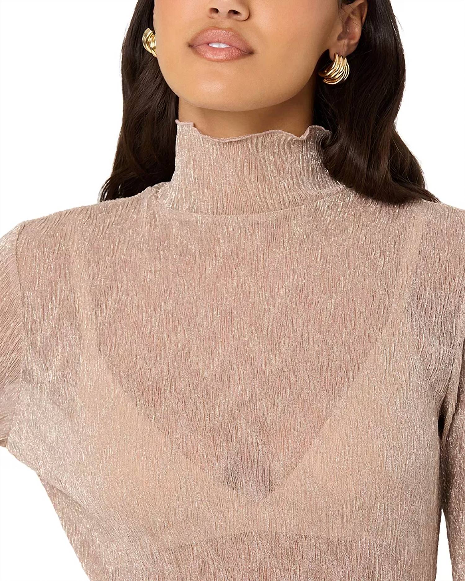 Pair this with your favorite jeans and slides for your next girls night out. Elevate your spring wardrobe with the luxurious Kyra Long Sleeve Turtleneck Top by ASTR, offered in a shimmering champagne hue. This turtleneck features long sleeves and a pull-on style, showcasing a semi-sheer, textured metallic finish for a minimalist yet eye-catching look. Crafted from 100% polyester and imported, it maintains its elegant glow with easy hand wash care. Model is 5'10", measurements: 33" bust, 25" waist, 35" hips, and wears a size small.
