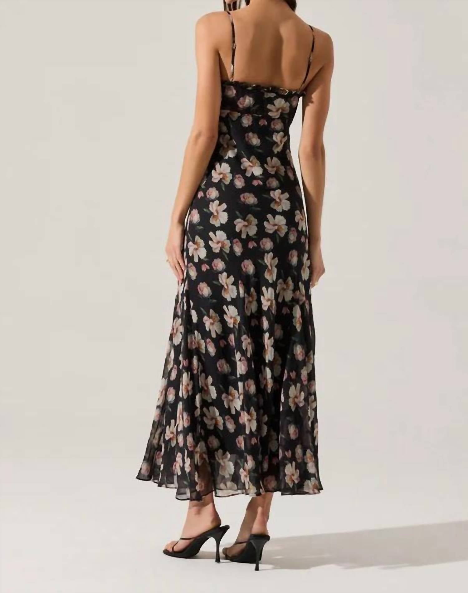Style this maxi with your favorite statement necklace and sandals for the perfect look. Introducing the Maeryn Sweetheart Ruffle Maxi Dress by ASTR, where boho chic meets elegance. This stunning piece features delicate spaghetti straps and a graceful A-line silhouette, adorned with a black floral pattern perfect for a dinner party. Made from 100% polyester and designed with a convenient side zipper closure, this dress promises both style and comfort. Care instructions include dry clean only and line dry to maintain its pristine look.