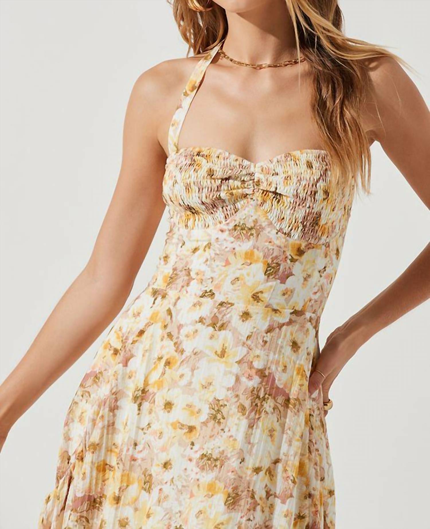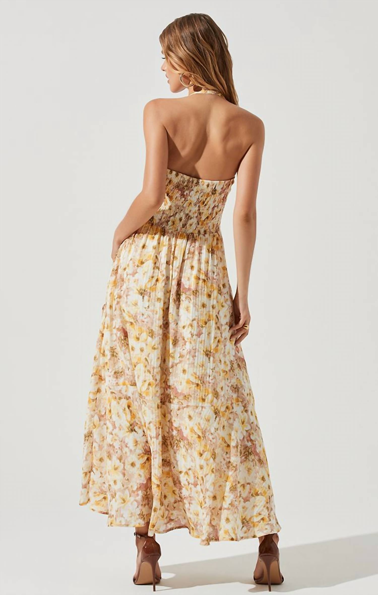 Who doesn't love a good maxi dress? This one you'll be reaching for season after season. Discover the allure of the Mariella Maxi Dress by ASTR, perfect for your summer dinner party. Crafted from a luxurious blend of 70% Viscose and 30% Linen, this sleeveless, floral-patterned dress features a halter neckline and smocked bodice, ensuring a flattering fit and flare silhouette. The maxi length and fully lined design in a taupe-yellow floral enhance its elegant appeal. Care instructions specify dry clean only, and the dress comes with adjustable straps and button features for a tailored fit.