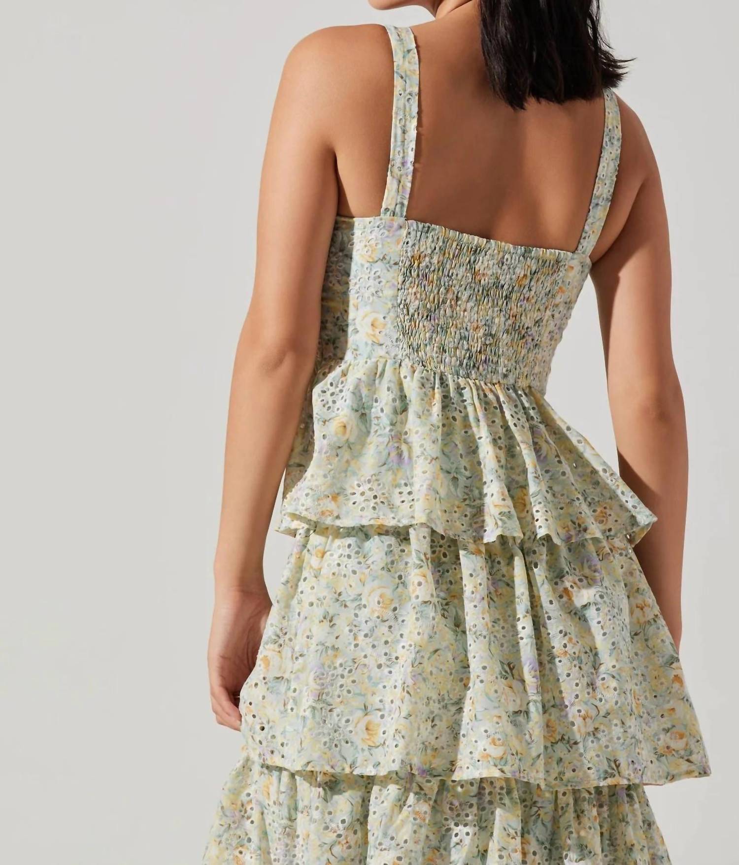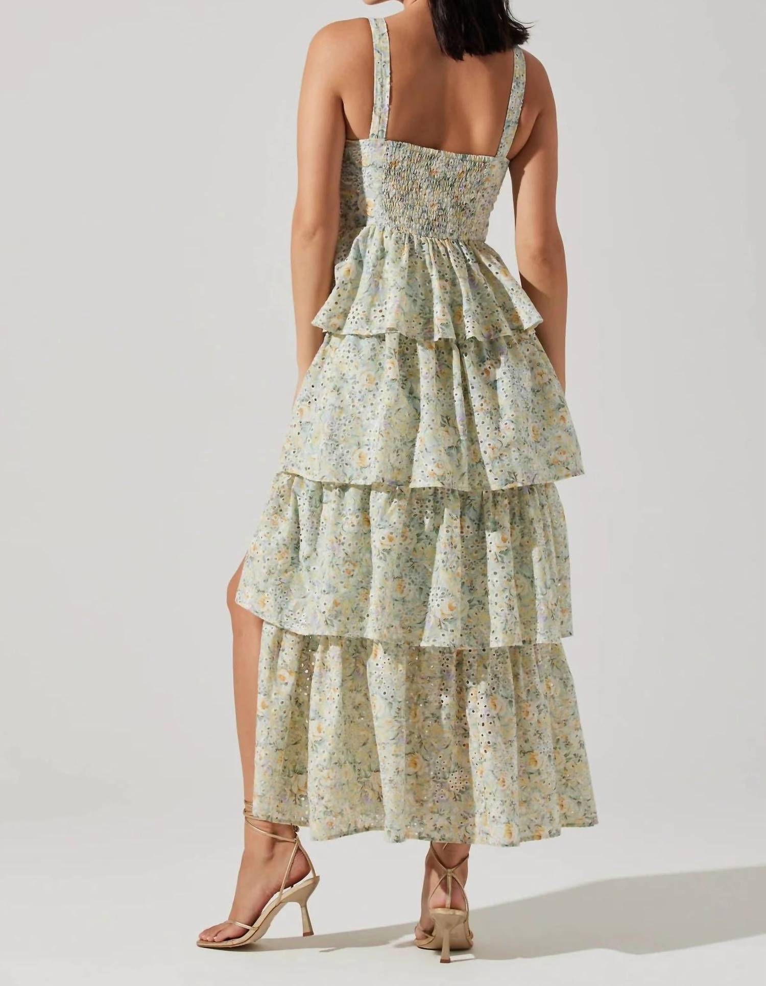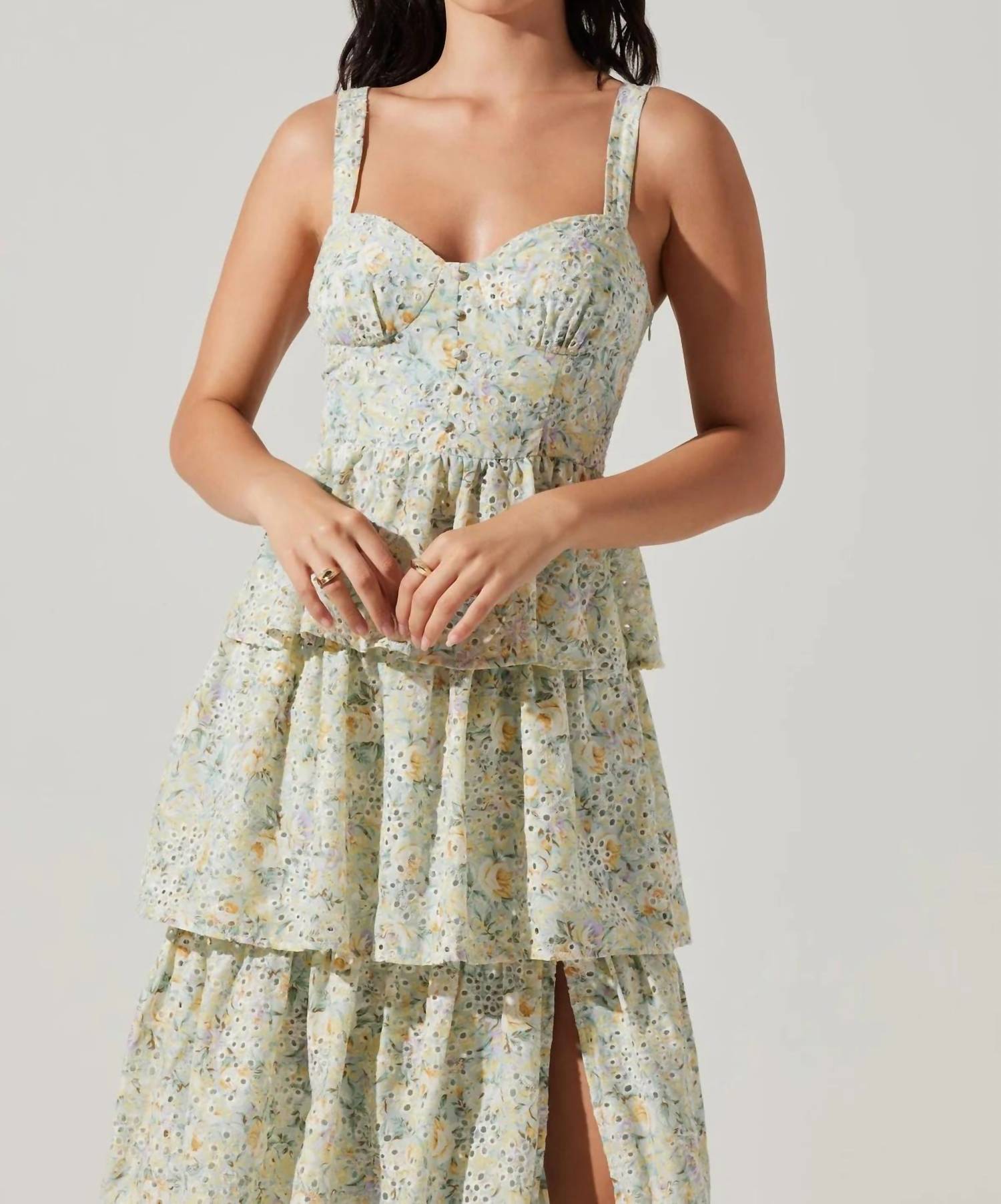 Style this maxi with your favorite statement necklace and sandals for the perfect look. Experience the essence of boho chic with the Midsummer Maxi Dress by ASTR, in a captivating light mint multi floral print. This sleeveless dress showcases a sweetheart neckline, a statement floral pattern, and a tiered ruffle skirt with a front slit accent for added flair. Made from 100% polyester with full 100% rayon lining, it features a covered button-down bodice and an invisible zipper closure. Its maxi length of 55 3/8" provides a graceful silhouette, while the smocked back ensures a perfect fit. Care: Dry clean only.