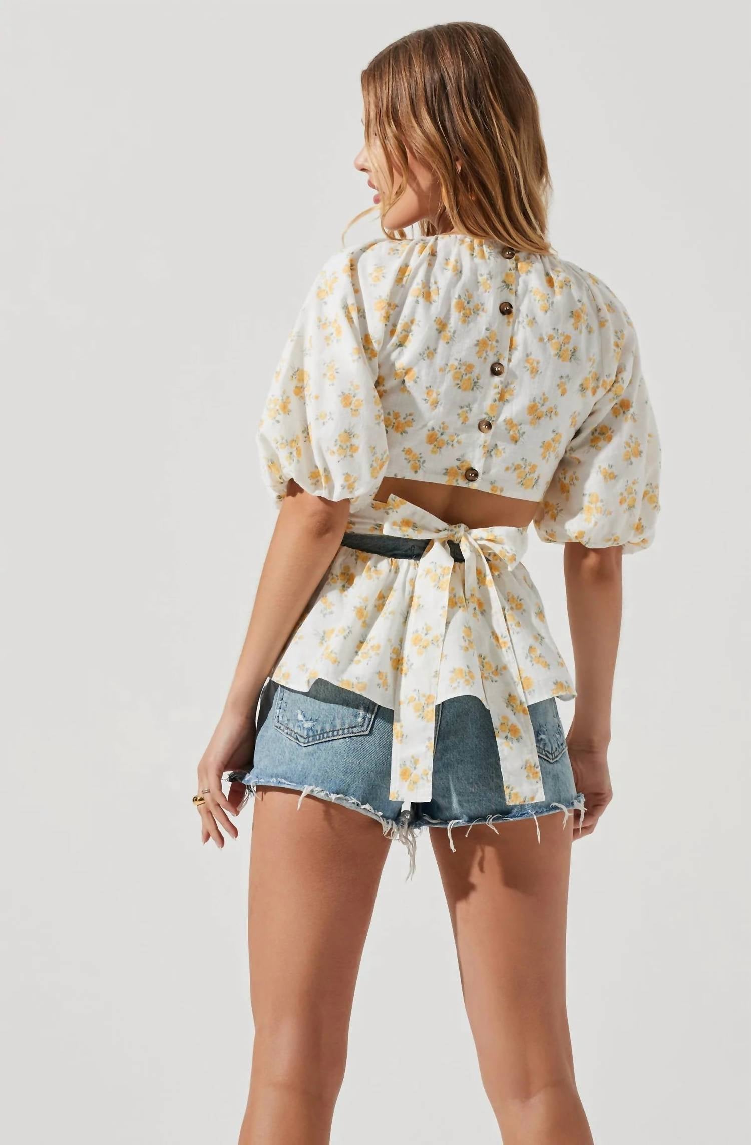 A versatile blouse that works from desk to dinner! Introducing the Vendetti Short Puff Sleeve Top by ASTR, a chic addition to your spring wardrobe. This blouse showcases a flattering round neckline and a defined waist, complemented by short puff sleeves. Crafted from a comfortable linen blend with 55% linen and 45% viscose, it features a charming floral print in white and yellow. Designed with a cutout back and button closure, it requires dry cleaning and promises an elegant, minimalist look suitable for a dinner party.
