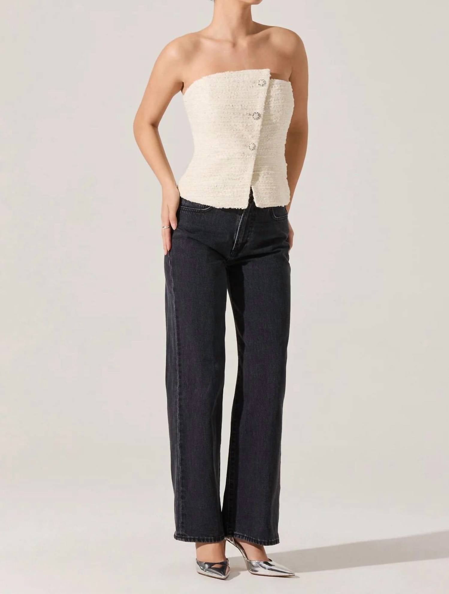Show a little skin in this cute and casual crop top. Discover the ASTR XOXO Asymmetrical Tweed Top, an elegant crop top that combines a textured pattern with chic button detailing for a refined look. In a sophisticated cream color, this strapless, off-the-shoulder design is crafted from a blend of polyester, wool, and rayon, exuding quiet luxury for any dinner party. Closure: Zip closure.