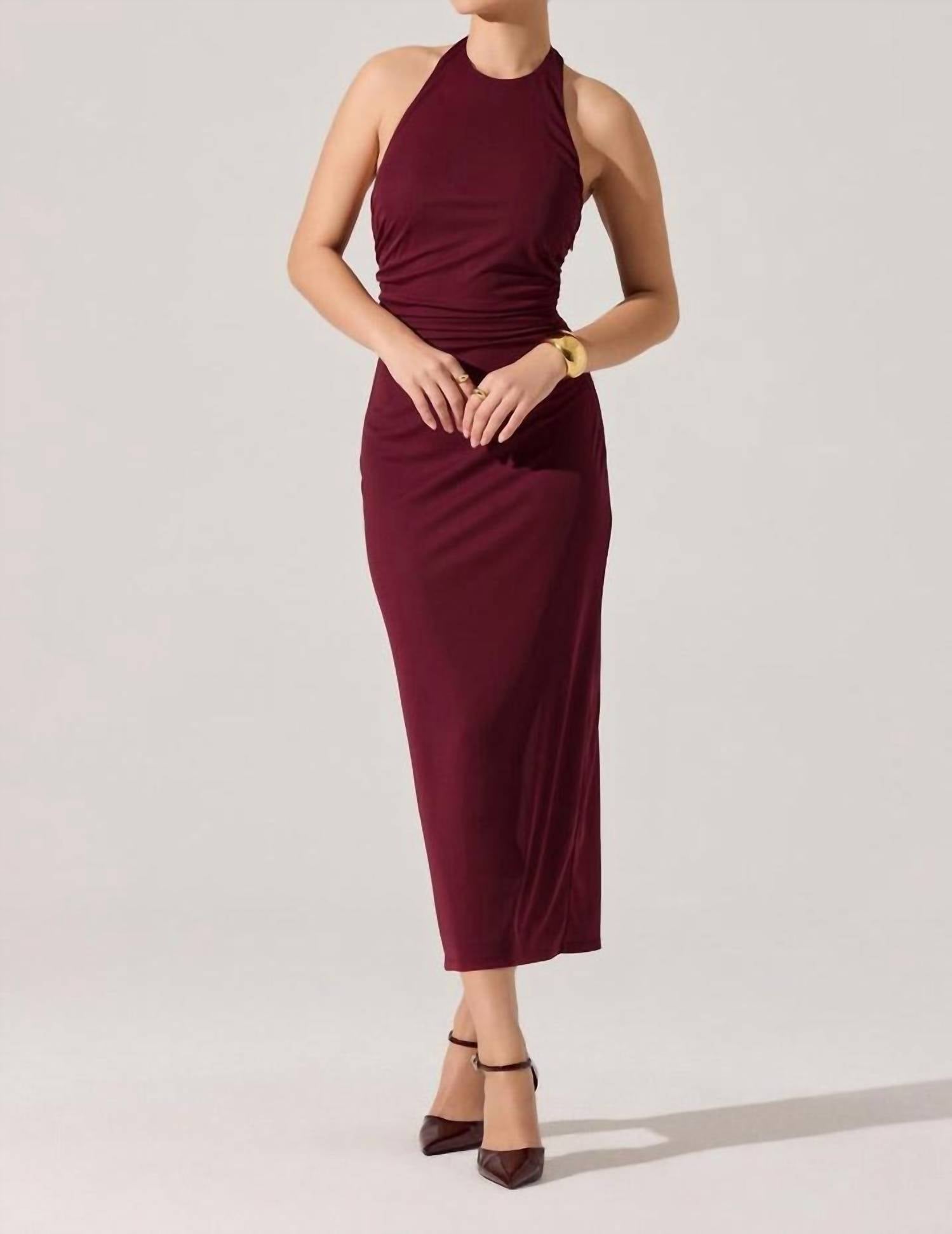 Just add slides or mules and you are good to go. Elevate your evening wardrobe with the Zaira Midi Dress by ASTR, a stunning wine-colored piece designed for sophisticated celebrations. This sleeveless halter dress features a bodycon silhouette, with ruching along the sides for a draped effect and an exposed back with twist knot detail. Composition: Self and lining both consist of 95% Polyester, 5% Elastane. Closure: Concealed zipper with button closure at the neck. Care: Hand wash cold, do not bleach, line dry, iron low if needed, do not tumble dry. This quiet luxury piece is perfect for spring occasions.