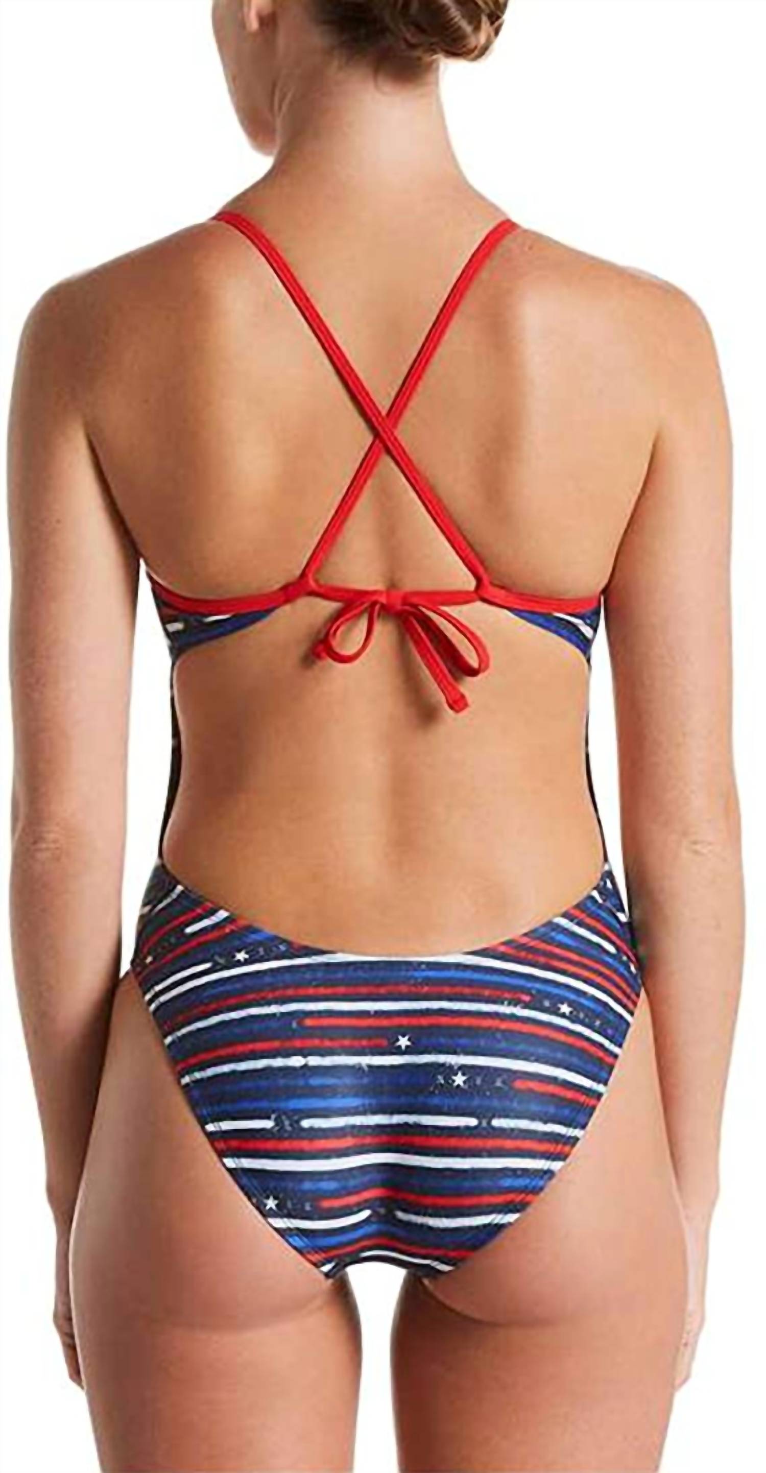 This one piece fits like a glove and covers all the right areas. Dive into summer with the NIKE Crossback Cut-out One Piece Swimsuit in University Red, perfect for any beach day. This swimsuit features adjustable tie-back straps and minimal coverage to maximize your range of motion, ideal for active beachgoers. Made from 82% polyester, it showcases a beautiful red, white, and blue design for a classic look.