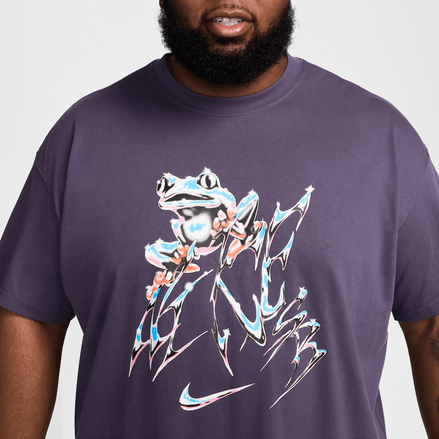 Introducing the Men's SB Frog Shirt by NIKE, a must-have for your streetwear collection. This short sleeve tee in Dark Raisin features dropped shoulders and longer sleeves, offering a roomy fit through the body and hips for a relaxed, casual vibe. Crafted from 100% cotton, this piece delivers midweight softness and durability, ideal for everyday comfort. Sporting an eye-catching graphic on both front and back, it comes complete with a ribbed crewneck collar and is easy to maintain with a machine wash. Made in imported quality and styled with a convenient pull-on closure, it's perfect for vacation or any casual occasion.