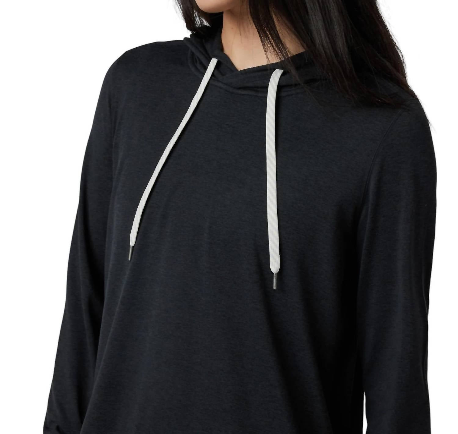 Discover the Halo Essential Hoodie by Vuori, an everyday must-have for activewear enthusiasts in Black Heather. This long sleeve, hooded pullover is crafted from our softest DreamKnit™ performance fabric, promising ultimate comfort with its 89% recycled polyester and 11% elastane blend. Featuring 4-way stretch and moisture-wicking properties, this hoodie ensures you stay dry and unrestricted. Its pull-on design is complemented by drawstrings for a personalized fit, and it is machine washable for easy care.
