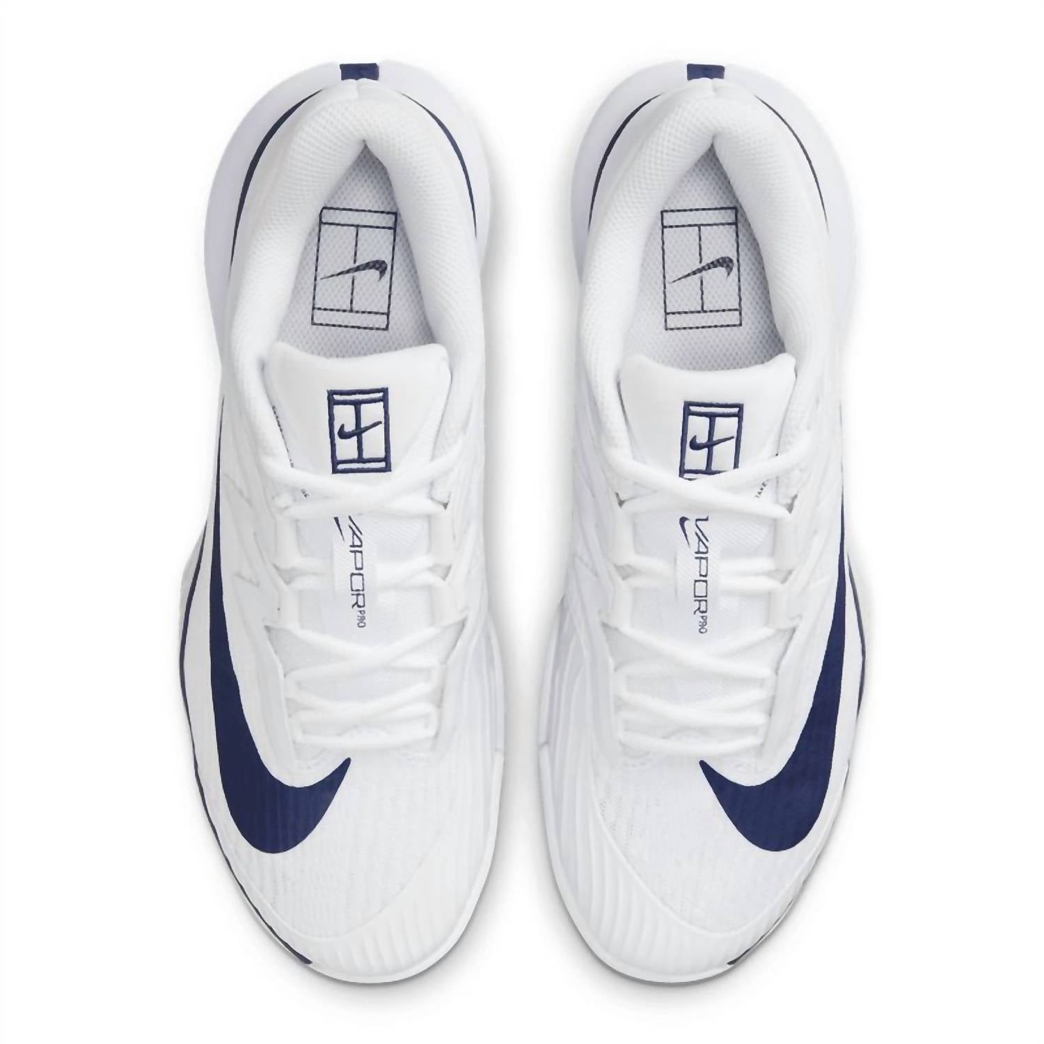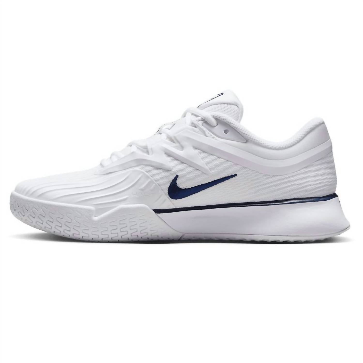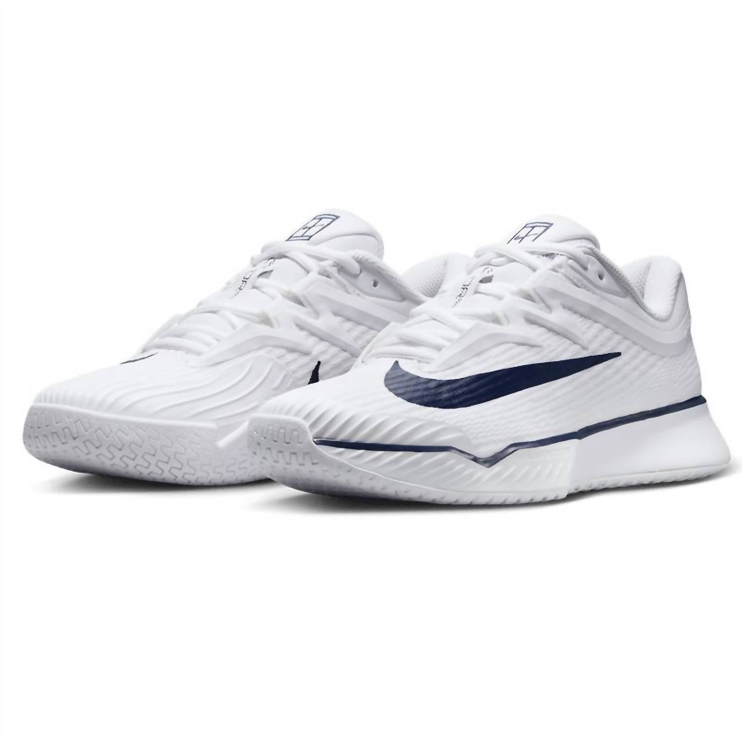 Stylish, comfortable and supportive. These athletic sneakers check all of the boxes. Step up your game with the Nike Women's Zoom Vapor Pro 3 Premium Tennis Shoes, optimized for hard court performance. Crafted with a durable mesh upper, these athletic shoes feature a Hex Forefoot Zoom Air Unit for responsive cushioning and dynamic flexibility. The midfoot fit band and redesigned eyestay deliver a secure, locked-in feel, while the plush comfort collar offers superior ankle support. Available in White/Midnight Navy, this lightweight design ensures unmatched speed, comfort, and durability with a medium arch and width.