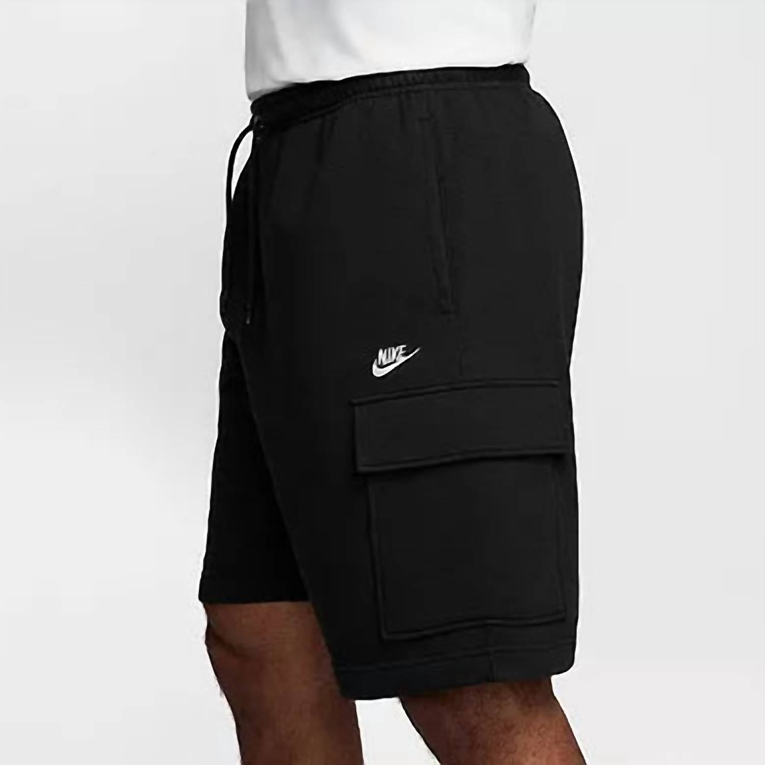 Match these cargo shorts with your favorite tank or tee for the perfect laid-back look. The Nike Sportswear Club Fleece Cargo Short in black is a versatile addition to any men's wardrobe, blending style and utility. Designed with an elastic waistband and adjustable drawcord for a secure fit, these cargo shorts are crafted from a soft, brushed-back fleece made of an 80% cotton and 20% polyester blend, with side pockets of 100% cotton. Additional features include a convenient flap pocket on the left leg for extra storage. Imported and machine washable, these shorts are perfect for an athleisure look on game day or any casual summer outing.