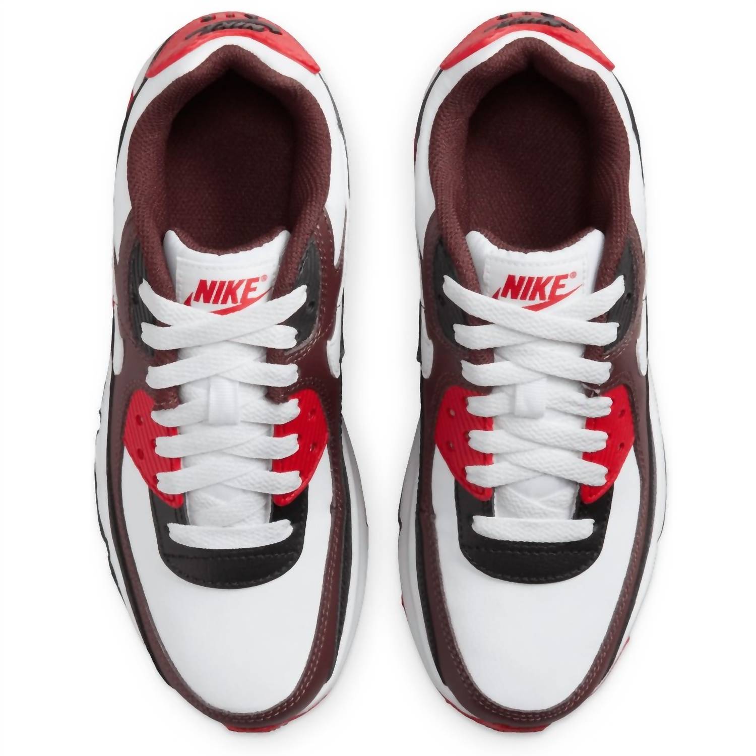 Get your young ones ready for stylish adventures with the Nike Kids Air Max 90 Sneakers in Burgundy Crush, perfect for big kids with a taste for streetwear. Featuring a classic '90s design with updates for modern comfort, these sneakers are crafted from high-quality leather. Equipped with visible Max Air cushioning for superior comfort and a padded, low-cut collar, these shoes also include a rubber waffle outsole for durable traction. Perfect for summer travels or a casual Fourth of July outing, these sneakers come with classic variable width lacing for a secure fit.