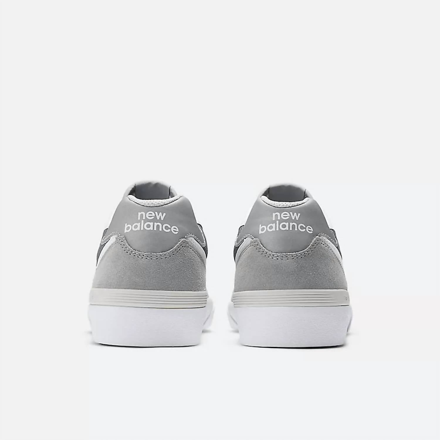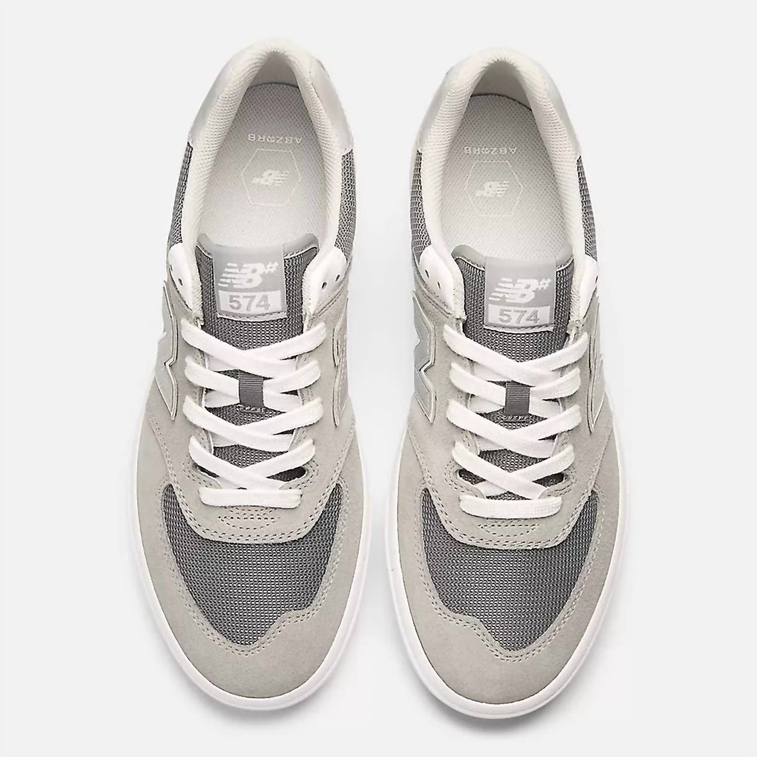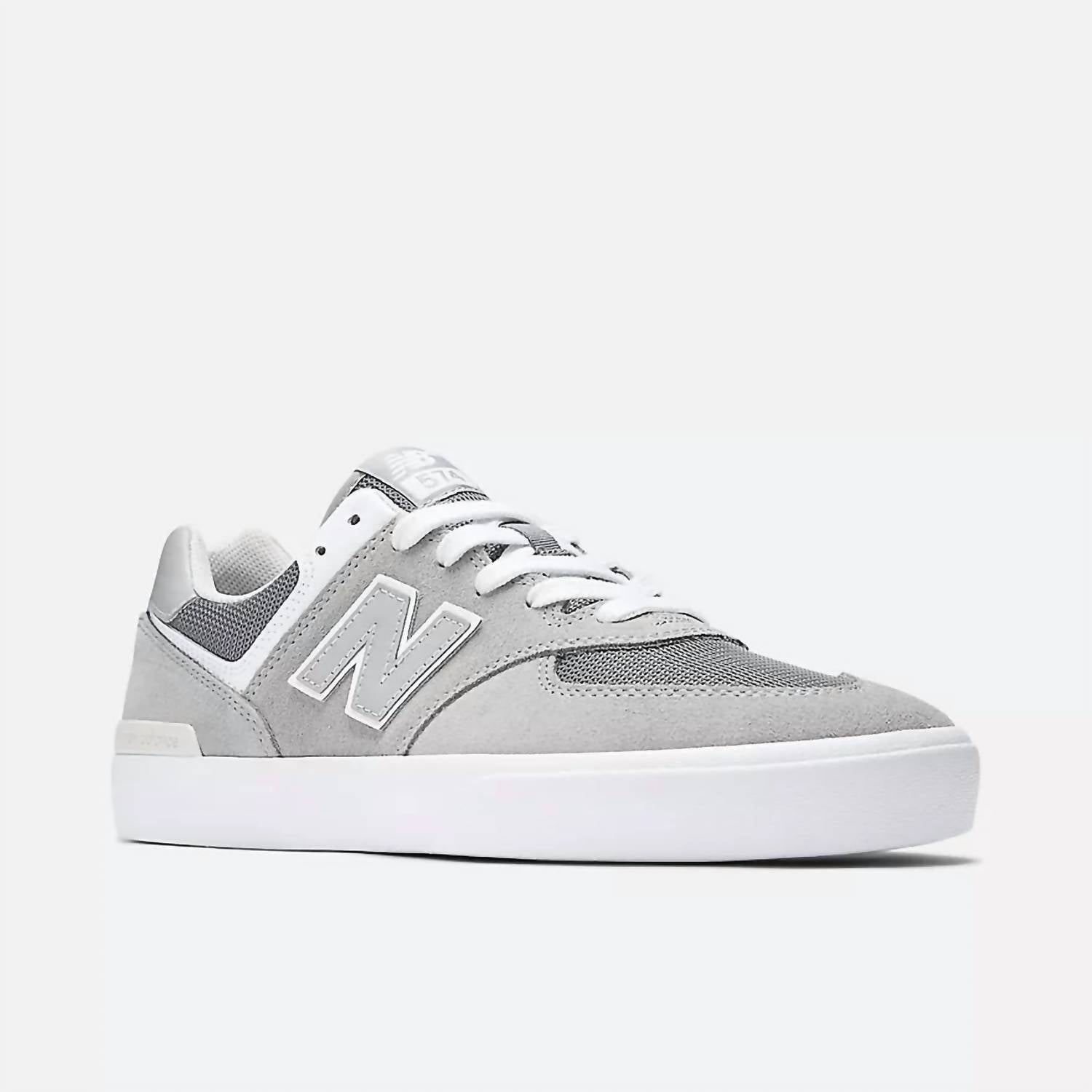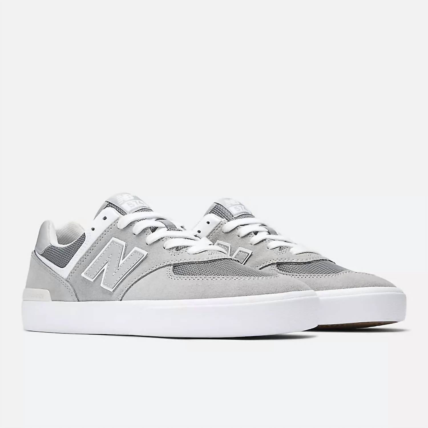 Introducing the Men's Numeric 574 Skate Shoes by New Balance, combining heritage style with modern functionality. This white and grey sneaker features a vulcanized rubber outsole, providing excellent board feel, and a reinforced upper in high abrasion areas for durability. With inspiration drawn from the classic 574 running shoe, it offers a comfortable fit at 506 grams (17.8 oz). Designed with a round toe and flat under 1" heel, these skate shoes are perfect for music festivals and summer athleisure looks.