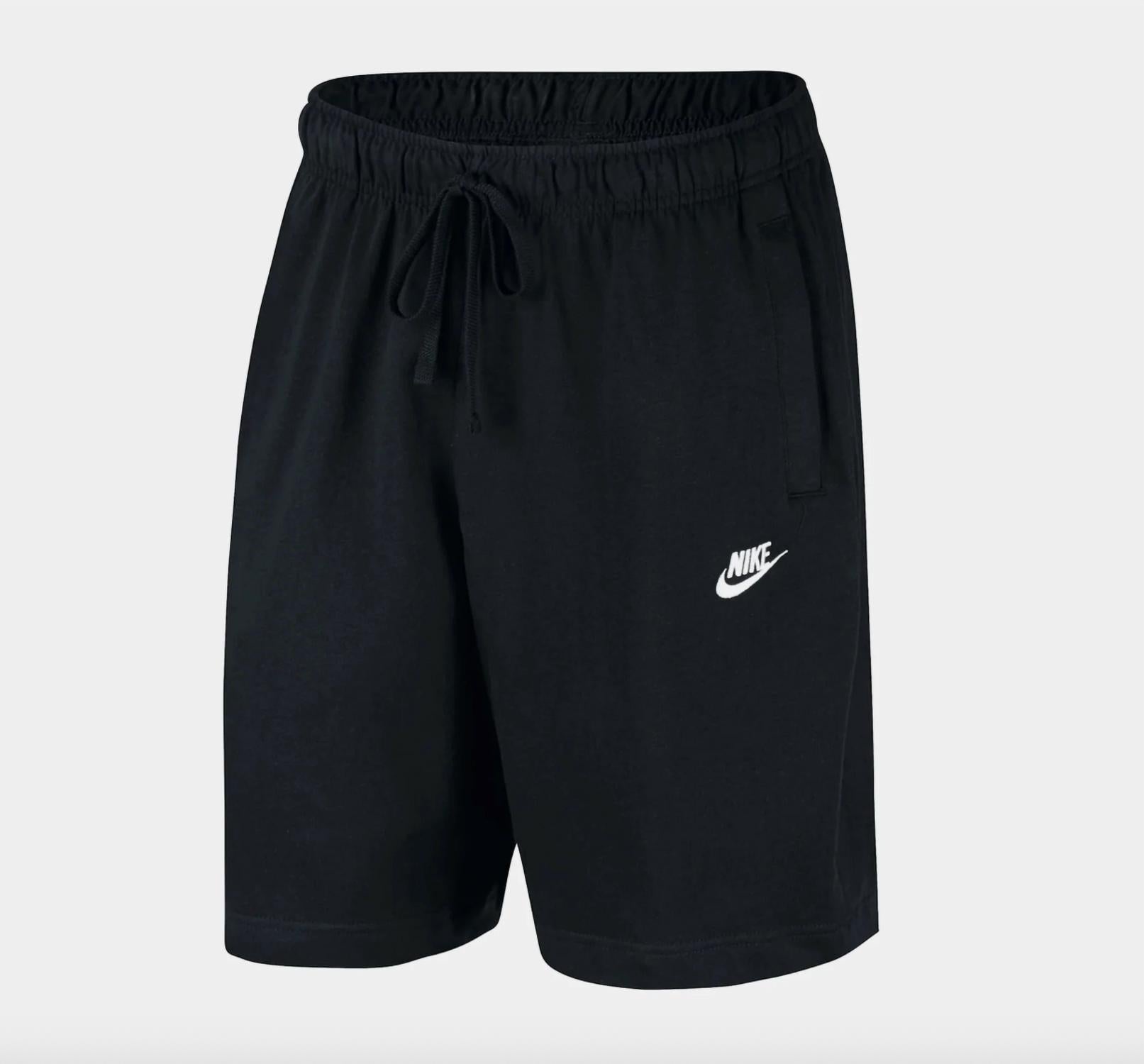 The Men's Jersey Shorts by Nike are a must-have for a comfortable and stylish summer look. These solid black athletic shorts are perfect for vacation, featuring a convenient tie closure and handy pockets. Designed in a monochrome pattern, they offer a sleek and versatile addition to your wardrobe. Ideal for men's casual wear, these shorts are perfect for summer outings.