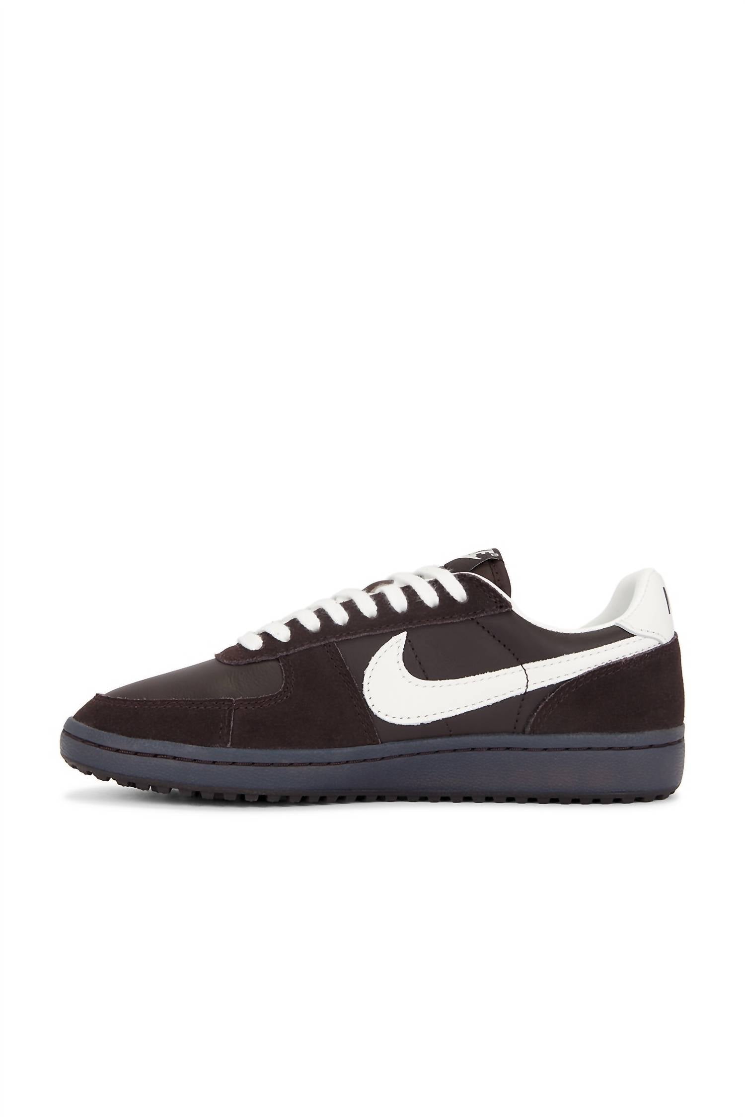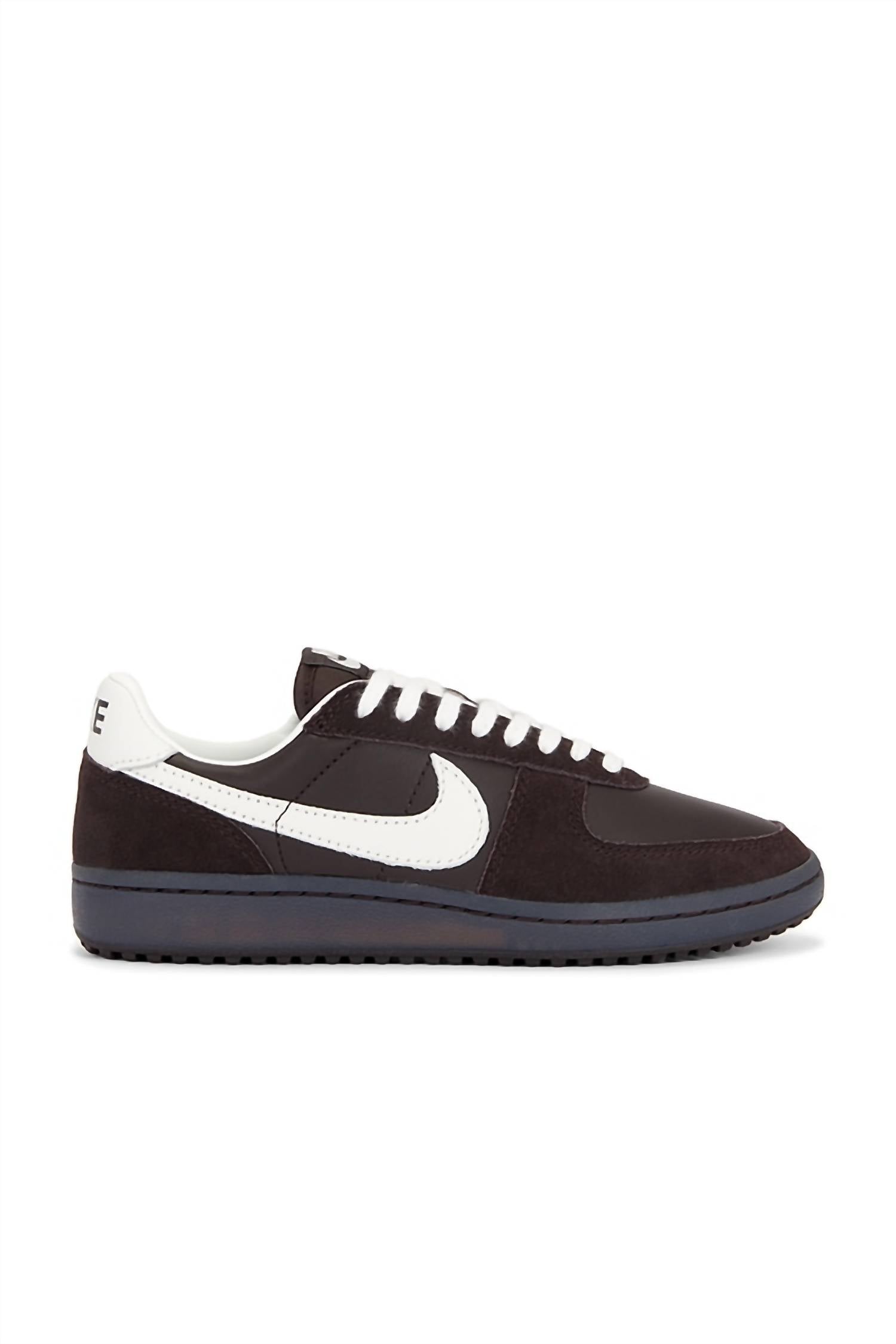 Introducing the Women's Field General Sneaker by NIKE, a bold reimagining of a classic with velvet brown and sail hues. Crafted from genuine smooth leather and soft suede, this sneaker captures a vintage '80s gridiron aesthetic. Its foam midsole provides comfort, while the nubby Waffle rubber outsole ensures durable traction. Perfect for fashion enthusiasts, this sneaker carries the manufacturer ID HV5130-220.