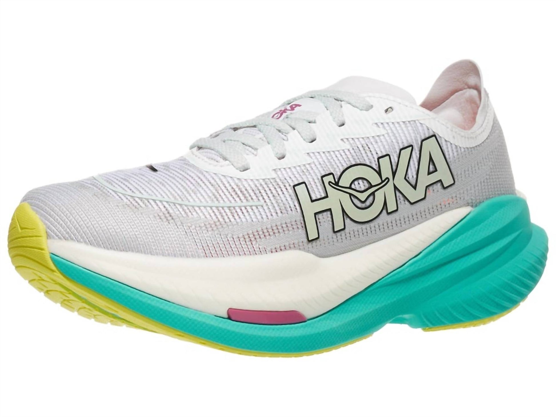 Stylish, comfortable and supportive. These athletic sneakers check all of the boxes. Get ready for race-day performance with the Hoka Mach X 2 Ws, a cutting-edge running shoe perfect for everyday training. Designed by Hoka, this athletic shoe in FCQ Frost/Electric Aqua color bursts with energy, thanks to its highly resilient PEBA superfoam midsole complemented by an EVA foam chassis, delivering cushioned landings and dynamic toe-offs. The round toe design and flat heel make it ideal for women seeking athleisure footwear for fitness or workout occasions, especially during the summer season. The shoe's race-inspired geometry with an aggressive rocker profile ensures a fast, snappy ride.